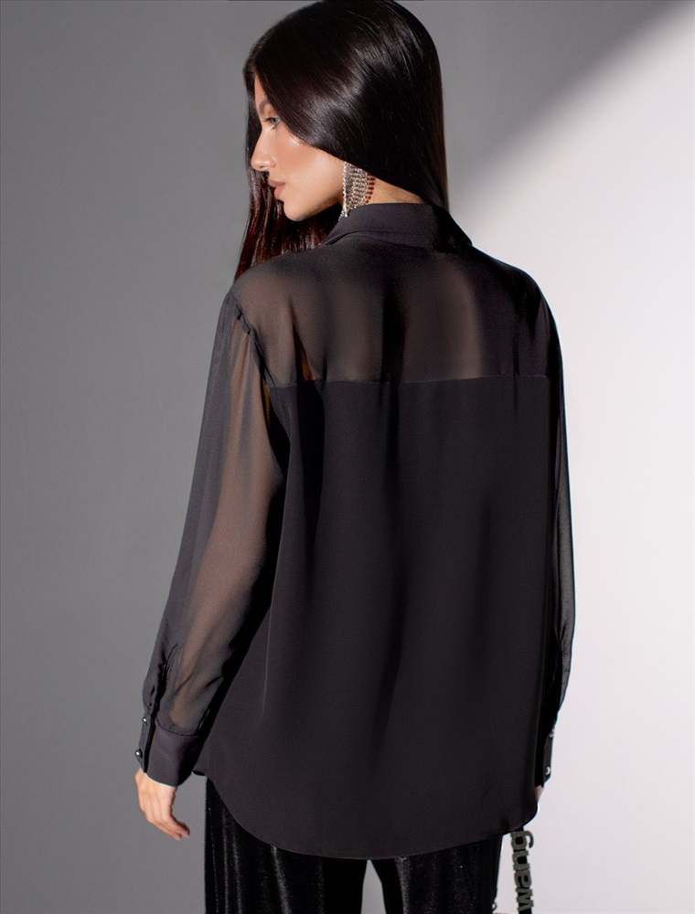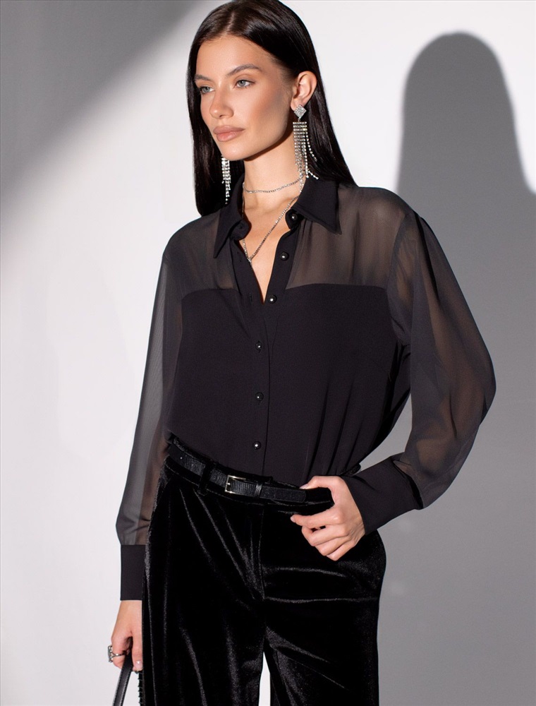 Элегантная блузка черного цвета создана для женщин, которые ценят стиль и комфорт каждый день. Полупрозрачный шифон в верхней части блузки придает образу легкость и утонченность, подчеркивая индивидуальность в любой ситуации. Такая нарядная блузка моментально преобразит повседневный лук, делая его более выразительным и женственным. Плотная ткань блузки красиво струится по фигуре, подчеркивая женственность. Оригинальный крой и продуманная отделка позволяют сочетать блузку с брюками, юбками или джинсами — вы всегда будете выглядеть свежо и современно. Текстура ткани обеспечивает максимальное удобство, а полупрозрачная структура добавляет загадочности без излишней откровенности. Стильная модель подходит как для деловых встреч, так и для прогулок по городу или вечерних мероприятий. Благодаря универсальности фасона легко создаются новые комбинации в зависимости от настроения и случая.