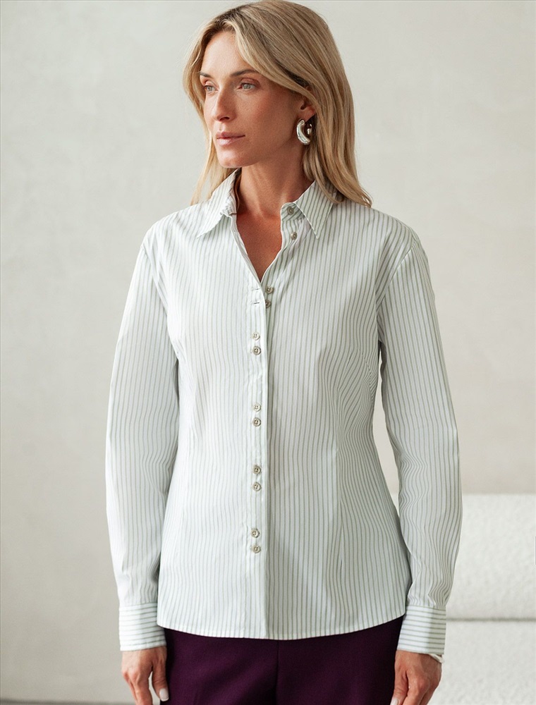Блузка прилегающего силуэта выполнена из формоустойчивого хлопка. Фишкой изделия служат парные контрастные пуговицы. На спинке фирменный металлический логотип бренда. Изделие хорошо держит форму, подчеркивает силуэт и подходит для любой фигуры. Идеальный вариант для респектабельных образов в деловом стиле.