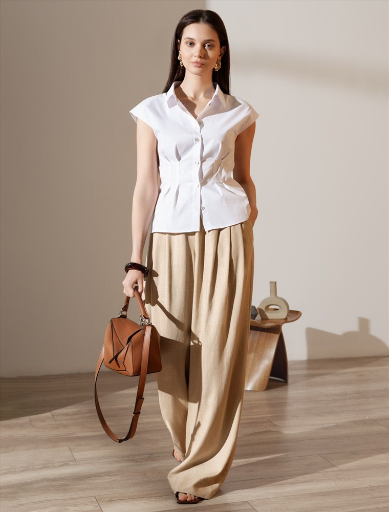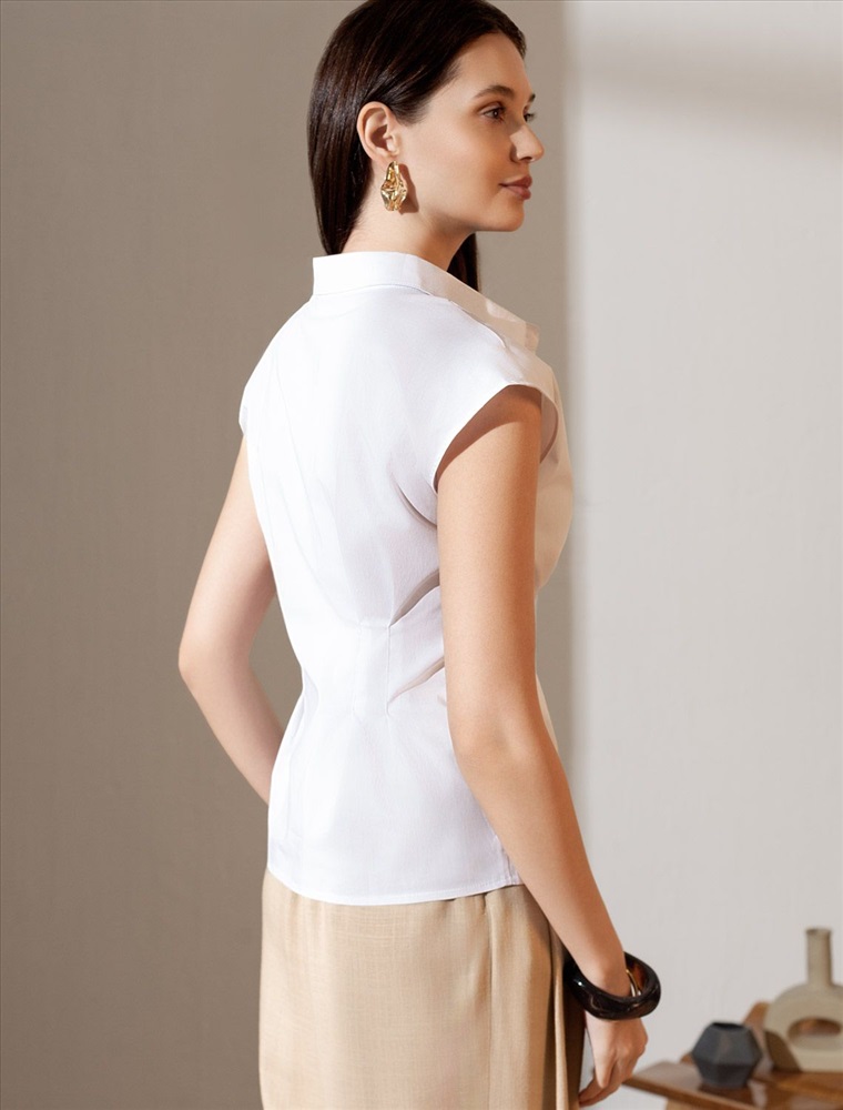 Изысканная женственная блузка белого цвета выполнена из легкого хлопкового поплина плотностью 96 Г/м2 и будет идеальна для создания комфортного и красивого образа в теплое время года. Натуральный материал отличается мягкостью и воздухопроницаемостью, что особенно ценно в жаркую погоду, а эластан в составе позволяет сохранить форму изделия. Основное преимущество повседневной блузки — аккуратный приталенный силуэт, подчеркивающий достоинства фигуры и создающий акцент на линии талии. Короткий цельнокроеный рукав придает образу свежесть и легкость. Однотонная рубашка с отложным воротничком подойдет для работы в офисе, встреч с друзьями, прогулок, для особого случая или праздника. Лаконичная легкая блузка отлично сочетается с разнообразными элементами гардероба, благодаря ей можно создать классический или романтичный образ.