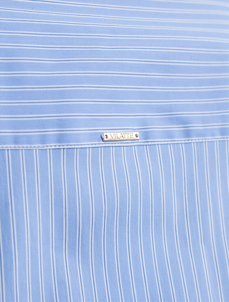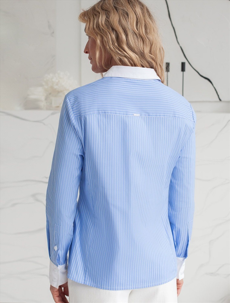 Плотность: 103 Г/м2 Стильная блузка голубого цвета в белую полоску приталенного силуэта подарит вам эффектный образ на весну и лето. Принт в полоску освежает внешний вид и стройнит фигуру и визуально вытягивает силуэт. Такой вид полосатой ткани называется пестротканой — полосы созданы переплетением нитей разных цветов. Смешанный состав ткани идеален для деловых блузок: хлопок приятен к телу, полиэстер повышает долговечность, ПУ (эластан) придает комфортную растяжимость. Идеально подходит для деловой работы и повседневной носки, подчеркивая вашу женственность и уверенность. Контрастные манжеты аккуратно оформлены и придают блузке дополнительный шарм, а воротник держит форму, добавляя образу элегантности. Блузка представлена так же в больших размерах, чтобы каждая могла подобрать вариант по своей фигуре. Эта красивая рубашка отлично сочетается с разными стилями и станет обязательной частью летнего гардероба. Простая, но стильная вещь, которая подчеркнет вашу индивидуальность и создаст эффектный образ.