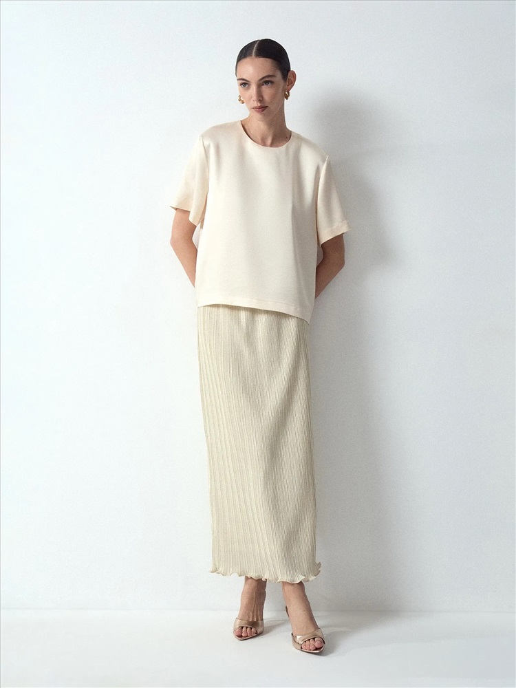 Обаятельная в своей лаконичности блузка подойдёт и к празднику, и на каждый день. Атлас нежного сливочного оттенка делает образ элегантным. Модель имеет круглый вырез и свободный короткий рукав. Застёгивается на крючки. На спинке под застёжкой располагается аккуратный вырез-капля. Дополнить образ можно любым базовым низом и стильным поясом.