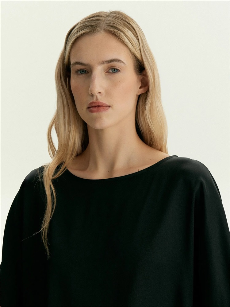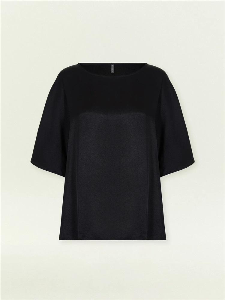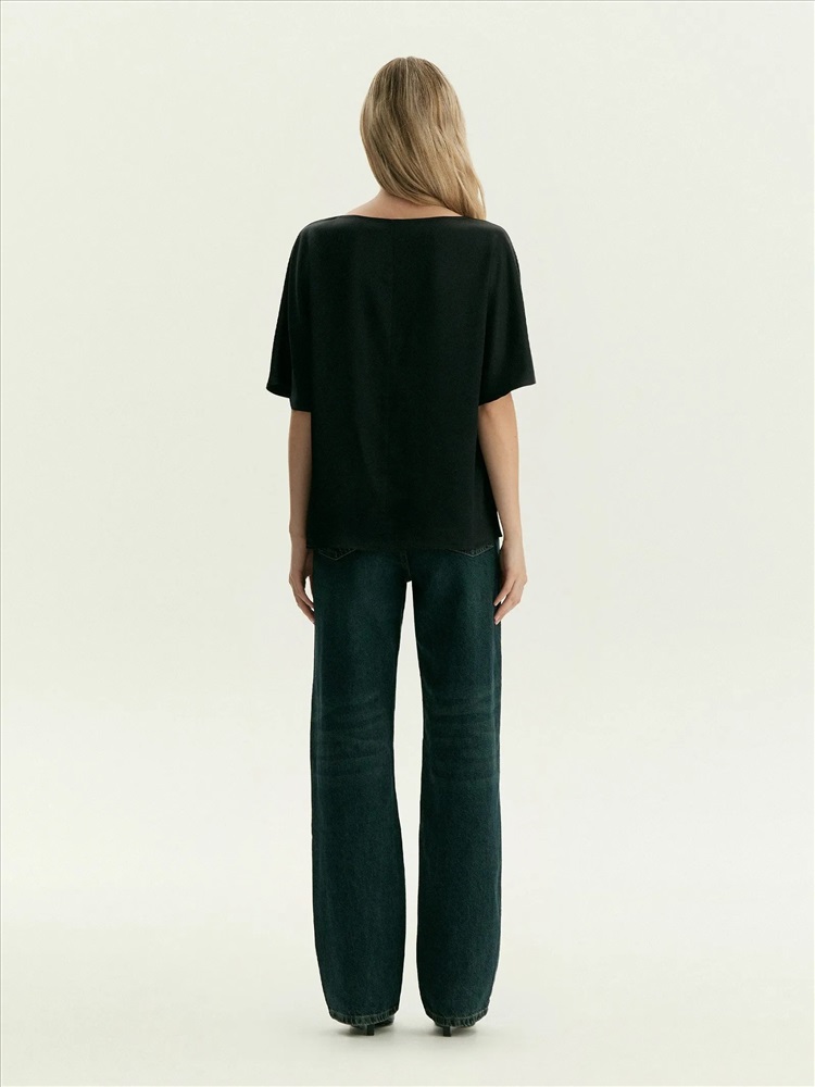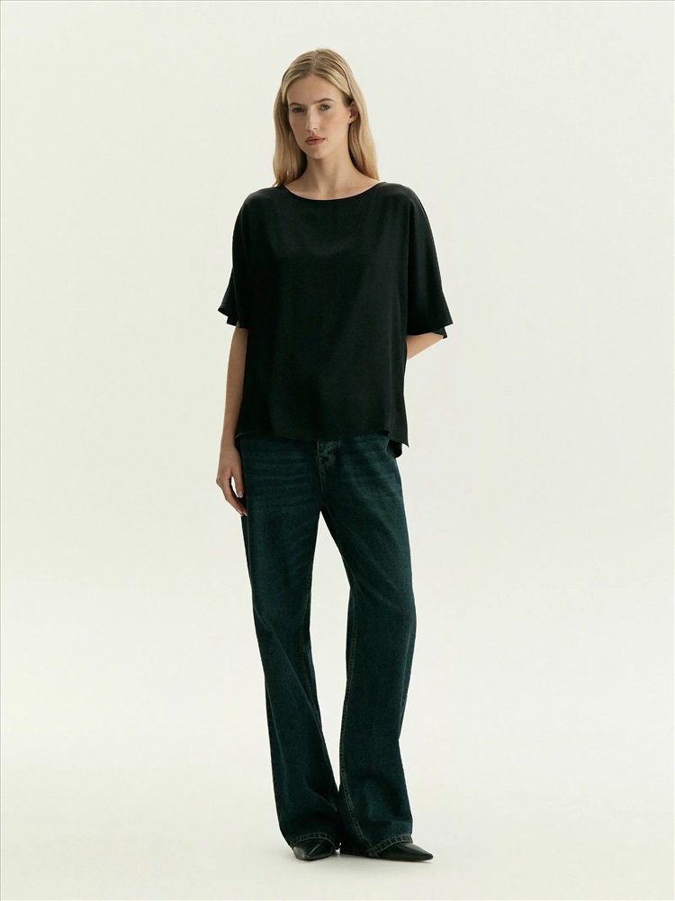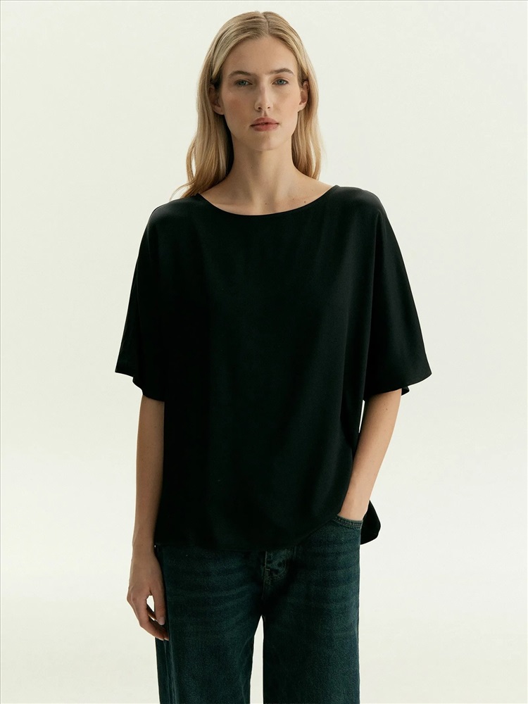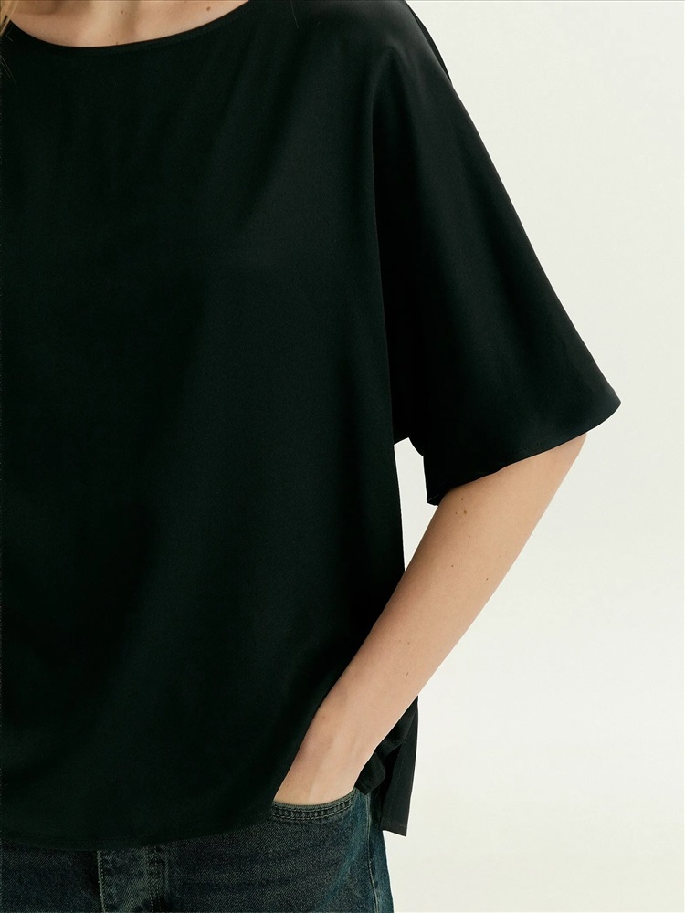 Блуза-футболка украсит повседневные образы и органично впишется в нарядные. Сделана из шелковистой ткани на основе вискозы. Модель имеет элегантный вырез-лодочку и стильный цельнокроеный рукав длиной до локтя. Сочетается с любым базовым низом и интересными юбками: сатиновыми, из органзы, тафты и так далее.