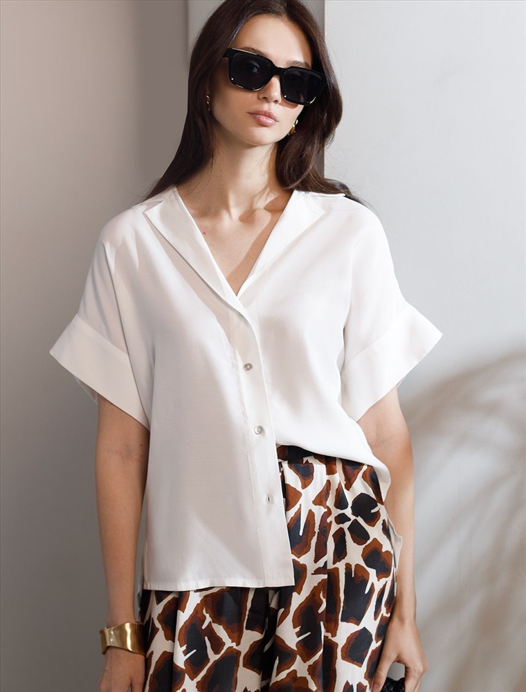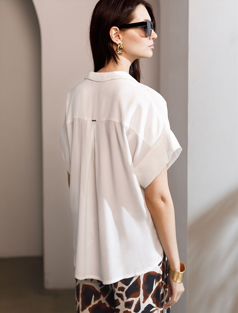 Плотность: 115 Г/м2 Блузка натурального белого цвета сочетает в себе комфорт и элегантность благодаря материалу из вискозы с лиоцеллом. Аккуратный отложной воротник подчеркивает утонченность образа, а широкие короткие рукава привлекают внимание и делают силуэт современным. Спущенная линия плеча формирует расслабленный, но стильный внешний вид, что идеально для тех, кто ценит индивидуальность и уверенность в деталях. Крой продуман так, чтобы подчеркивать достоинства фигуры и на больших размерах, создавая гармоничный силуэт без лишних усилий. Ткань из вискозы с добавлением лиоцелла обеспечивает приятные ощущения и отличную посадку, струится на теле и охлаждает в жаркую погоду. При пошиве использована технология «чистый край» по всей длине центральной планки и низу изделия. Это признак премиум качества — «чистый край» вместо оверлока. Блузку можно носить с топом, не застегивая — при этом распахнутая блузка будет выглядеть максимально эстетично. Рубашка легко впишется как в деловой гардероб, так и в повседневный стиль, позволяя выглядеть безупречно независимо от ситуации.