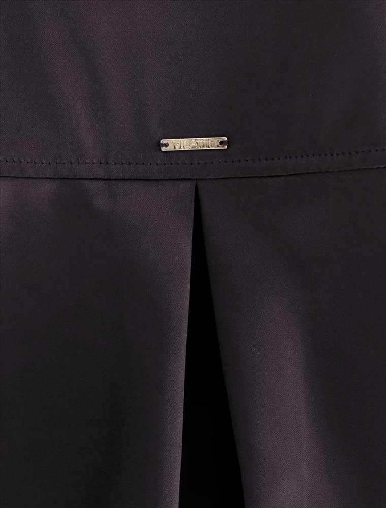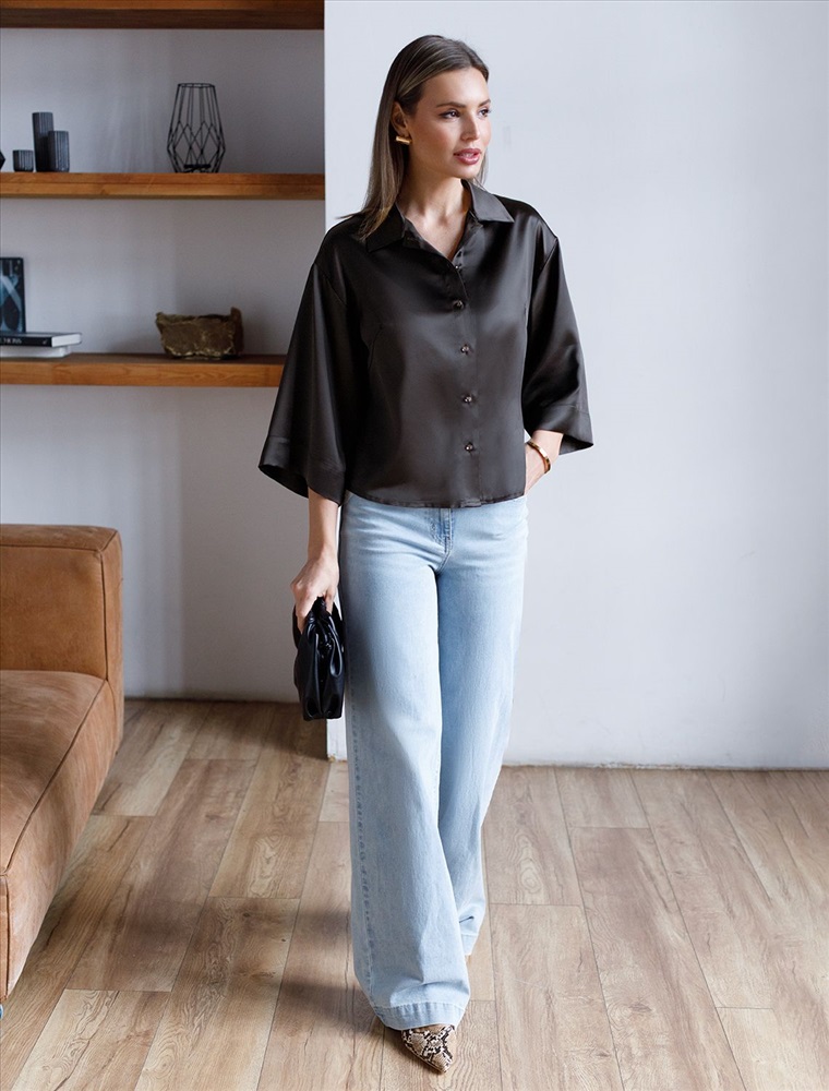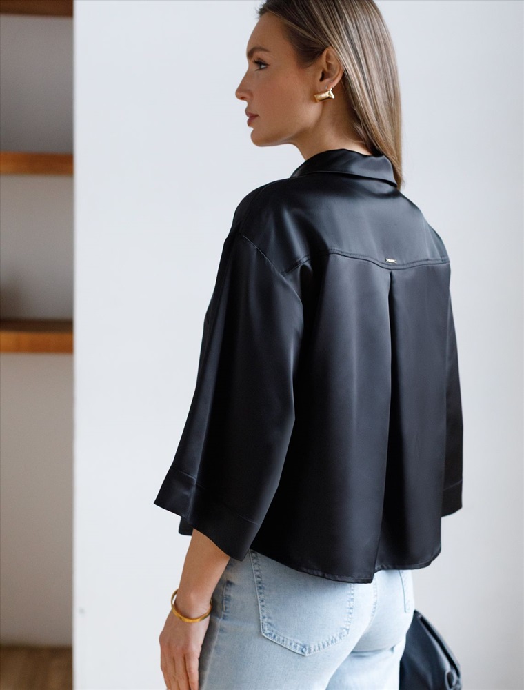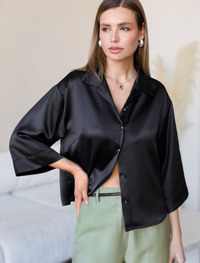 Элегантная блузка черного цвета на пуговицах выполнена из плотного струящегося сатина, который мягко ложится по фигуре и создает эффектную посадку. Отложной воротник придает образу женственную и изящную нотку. Материал отличается дышащей структурой, благодаря чему комфорт сохраняется даже в течение всего дня. Широкие рукава обеспечивают свободу движений и подходят для полных рук, делая блузку универсальной для разных типов фигур, в том числе для больших размеров. Красивая гладкая фактура материала подчеркивает утонченность изделия, добавляя легкое сияние к любому образу. Благодаря продуманному крою эта рубашка смотрится стильно как в повседневной жизни, так и на особых мероприятиях. Ткань практична, она приятна на ощупь, легко ухаживается и долго сохраняет первоначальный вид даже после многократных стирок и активной носки.