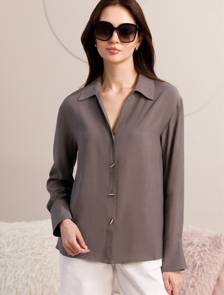 Блузка кофейного цвета сочетает в себе комфорт и элегантность благодаря материалу из вискозы с лиоцеллом. Аккуратный отложной воротник подчеркивает утонченность образа, а продолговатые металлические пуговицы золотистого цвета добавляют выразительный акцент и придают блузке благородный вид. Широкие манжеты на рукавах привлекают внимание и делают силуэт современным. Спущенная линия плеча формирует расслабленный, но стильный внешний вид, что идеально для тех, кто ценит индивидуальность и уверенность в деталях. Крой продуман так, чтобы подчеркивать достоинства фигуры и на больших размерах, создавая гармоничный силуэт без лишних усилий. Ткань из вискозы с добавлением лиоцелла обеспечивает приятные ощущения и отличную посадку, струится на теле и охлаждает в жаркую погоду. При пошиве использована технология «чистый край» по всей длине центральной планки и низу изделия. Это признак премиум качества — «чистый край» вместо оверлока. Блузку можно носить с топом, не застегивая — при этом распахнутая блузка будет выглядеть максимально эстетично.Рубашка легко впишется как в деловой гардероб, так и в повседневный стиль, позволяя выглядеть безупречно независимо от ситуации.