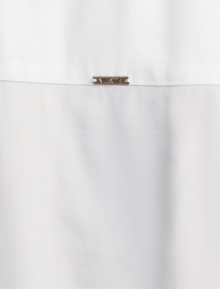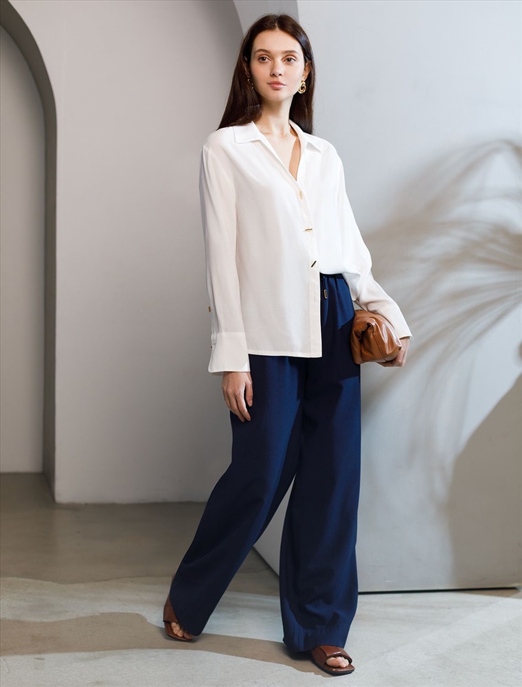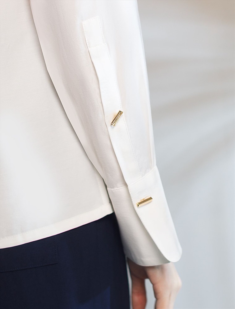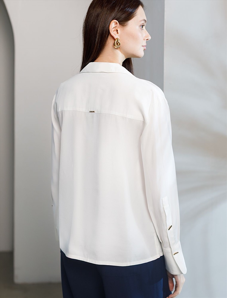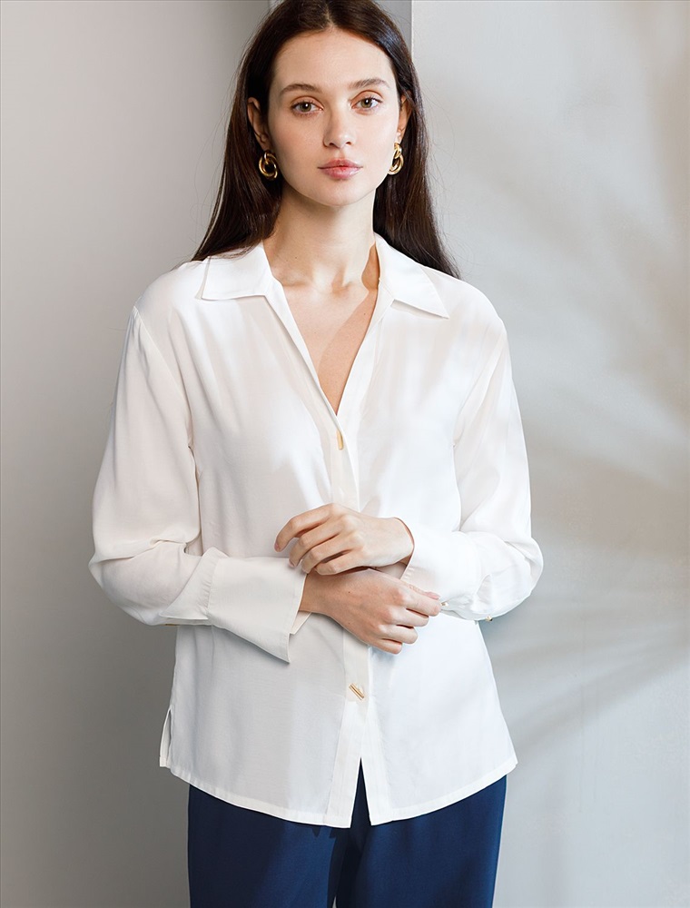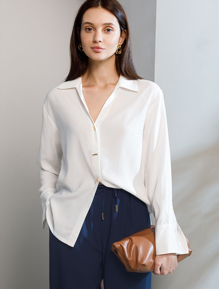 Блузка натурального белого цвета сочетает в себе комфорт и элегантность благодаря материалу из вискозы с лиоцеллом. Аккуратный отложной воротник подчеркивает утонченность образа, а продолговатые металлические пуговицы золотистого цвета добавляют выразительный акцент и придают блузке благородный вид. Широкие манжеты на рукавах привлекают внимание и делают силуэт современным. Спущенная линия плеча формирует расслабленный, но стильный внешний вид, что идеально для тех, кто ценит индивидуальность и уверенность в деталях. Крой продуман так, чтобы подчеркивать достоинства фигуры и на больших размерах, создавая гармоничный силуэт без лишних усилий. Ткань из вискозы с добавлением лиоцелла обеспечивает приятные ощущения и отличную посадку, струится на теле и охлаждает в жаркую погоду. При пошиве использована технология «чистый край» по всей длине центральной планки и низу изделия. Это признак премиум качества — «чистый край» вместо оверлока. Блузку можно носить с топом, не застегивая — при этом распахнутая блузка будет выглядеть максимально эстетично.Рубашка легко впишется как в деловой гардероб, так и в повседневный стиль, позволяя выглядеть безупречно независимо от ситуации.