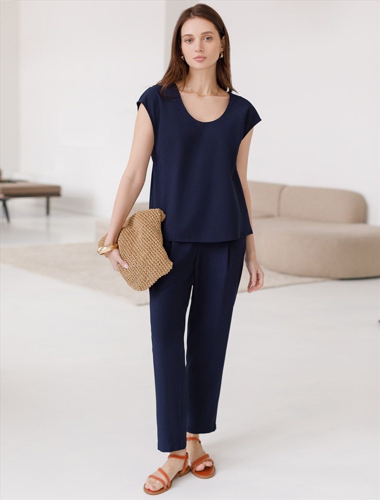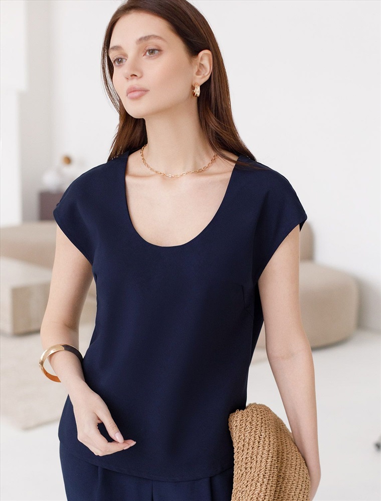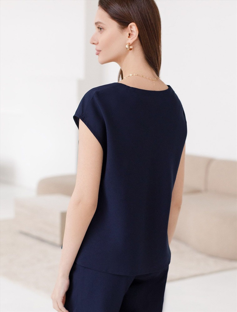 Плотность: 180 Г/м2 Элегантная блузка темно-синего цвета скроенная по косой выполнена из плотного лиоцелла. Лиоцелл это более дорогой и экологичный вариант вискозы, очень прочный и шелковистый. Эта повседневная блузка с трендовым U-вырезом создана для легкого и утонченного стиля. Мягкие линии кроя создают невероятно эффектный образ, который подчеркивает естественную красоту, не стесняя движений, а свободный фасон дарит ощущение абсолютного комфорта и уверенности. Блузка красиво драпируется при движении, создавая летящий, воздушный эффект. Эта легкая блуза с коротким рукавом идеальный выбор для комфорта и стиля в теплое время года, она будет идеальна для любого повода. Реомендуем сочетать с артикулами: D24.310, D24.311, D26.203 Комментарии к товару