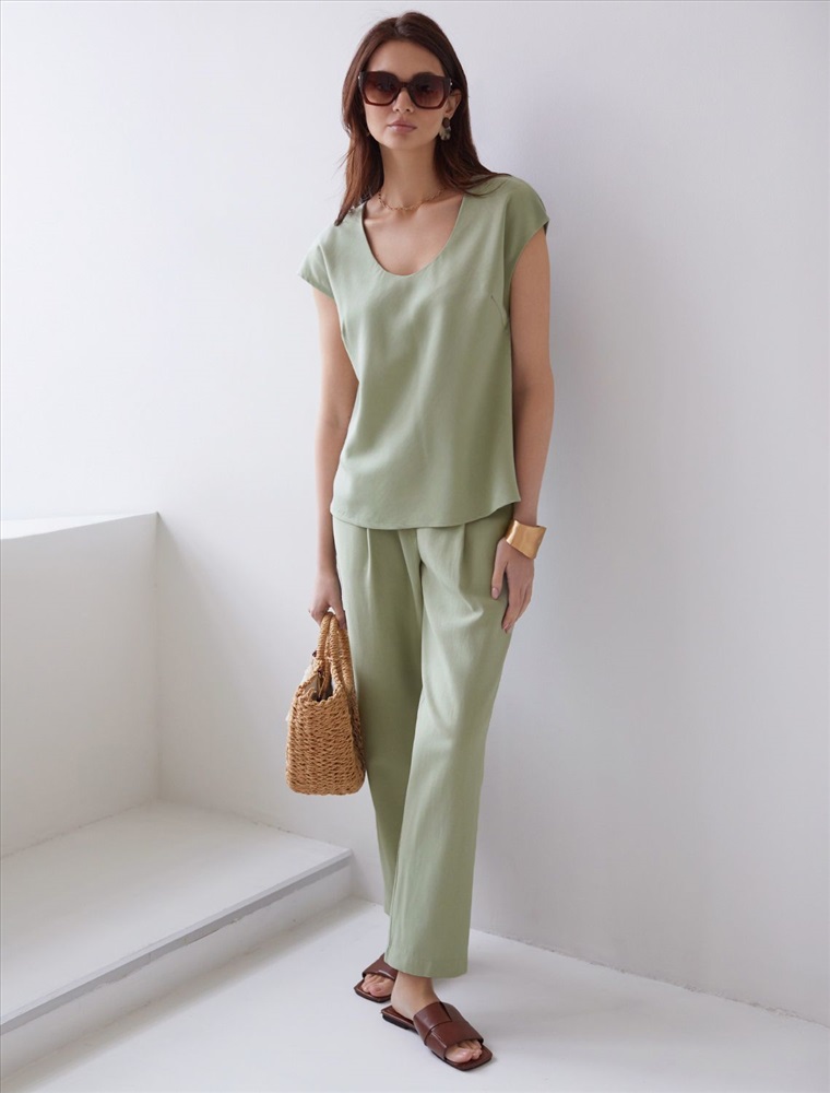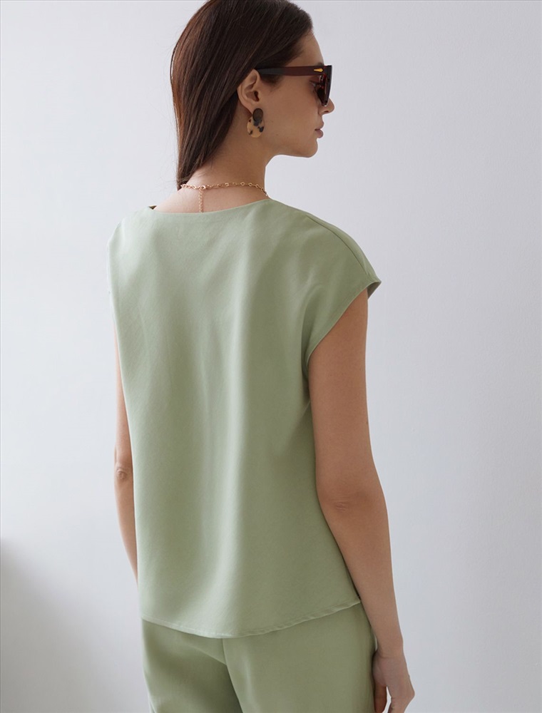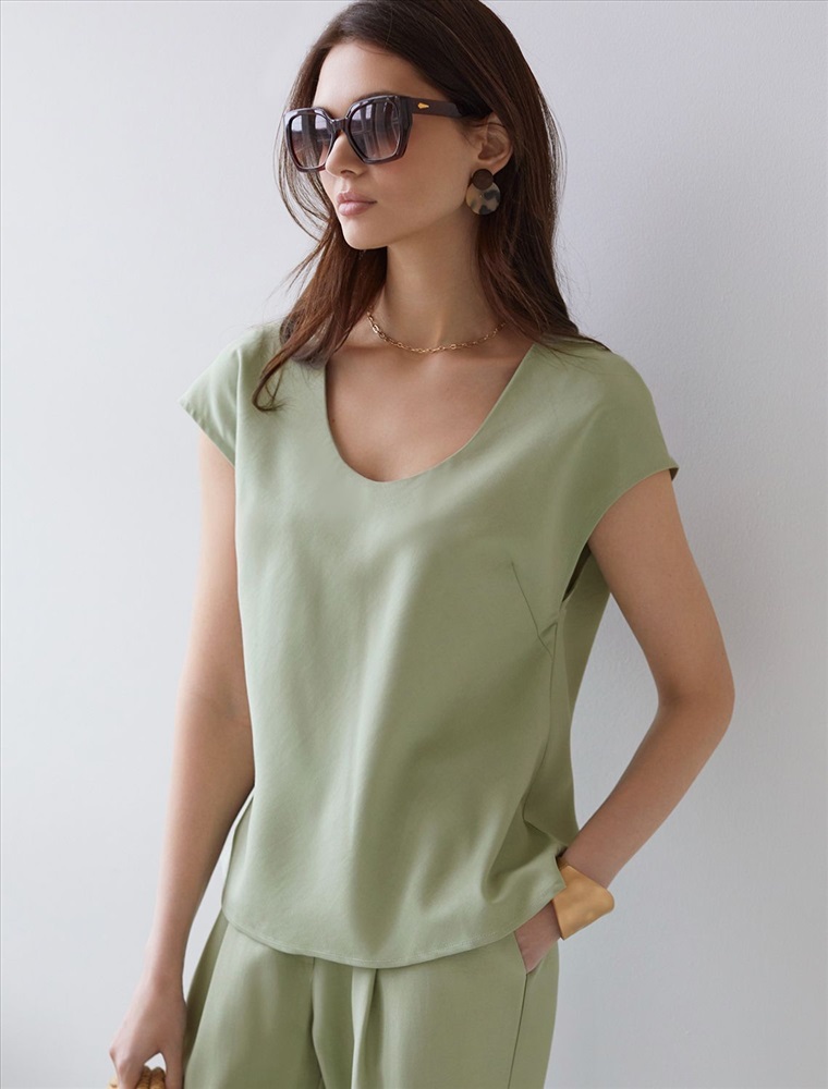 Плотность: 180 Г/м2 Элегантная блузка светло-зеленого цвета скроенная по косой выполнена из плотного лиоцелла. Лиоцелл это более дорогой и экологичный вариант вискозы, очень прочный и шелковистый. Эта повседневная блузка с трендовым U-вырезом создана для легкого и утонченного стиля. Мягкие линии кроя создают невероятно эффектный образ, который подчеркивает естественную красоту, не стесняя движений, а свободный фасон дарит ощущение абсолютного комфорта и уверенности. Блузка красиво драпируется при движении, создавая летящий, воздушный эффект. Эта легкая блуза с коротким рукавом идеальный выбор для комфорта и стиля в теплое время года, она будет идеальна для любого повода. Реомендуем сочетать с артикулами: D24.310, D24.311, D26.203 Комментарии к товару