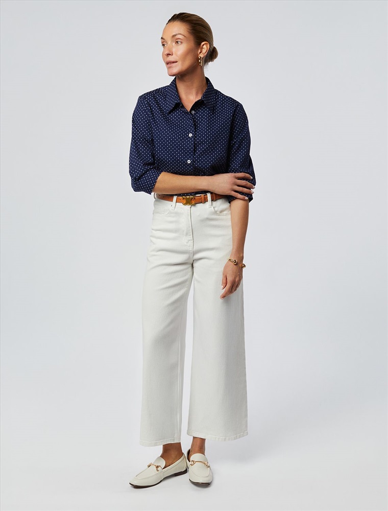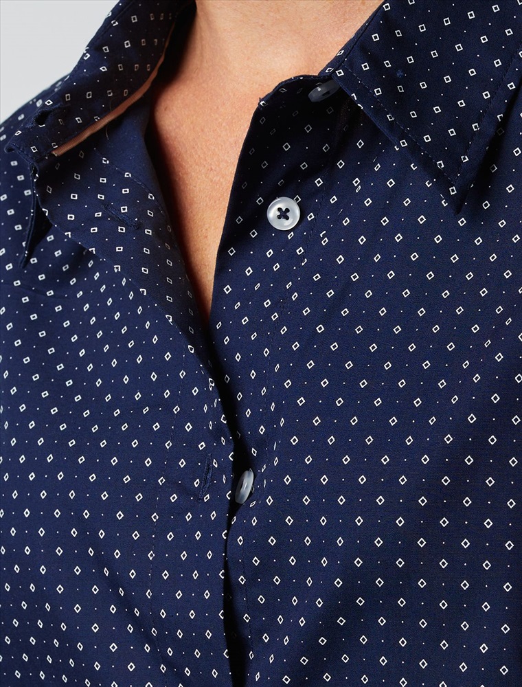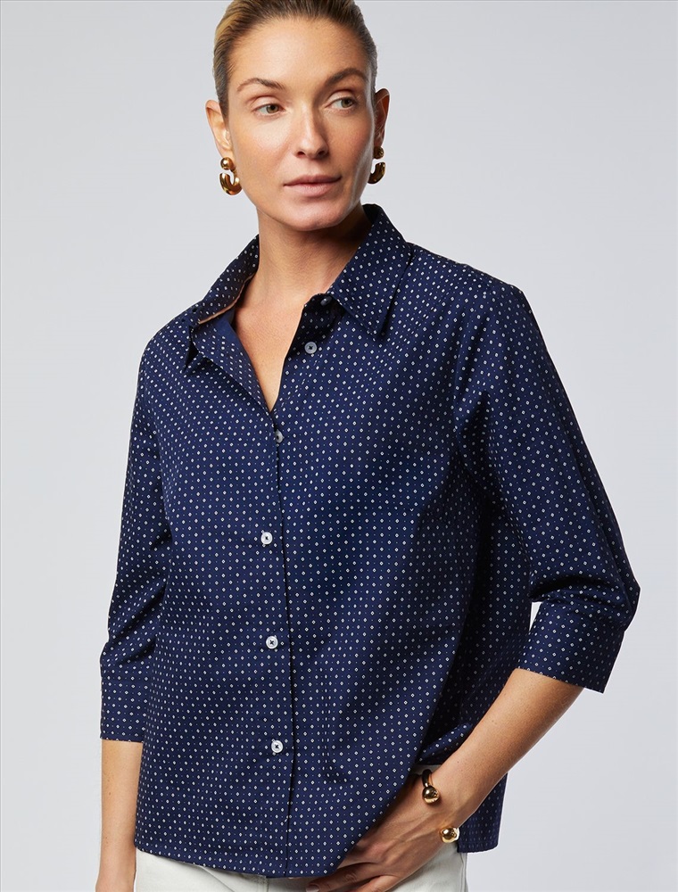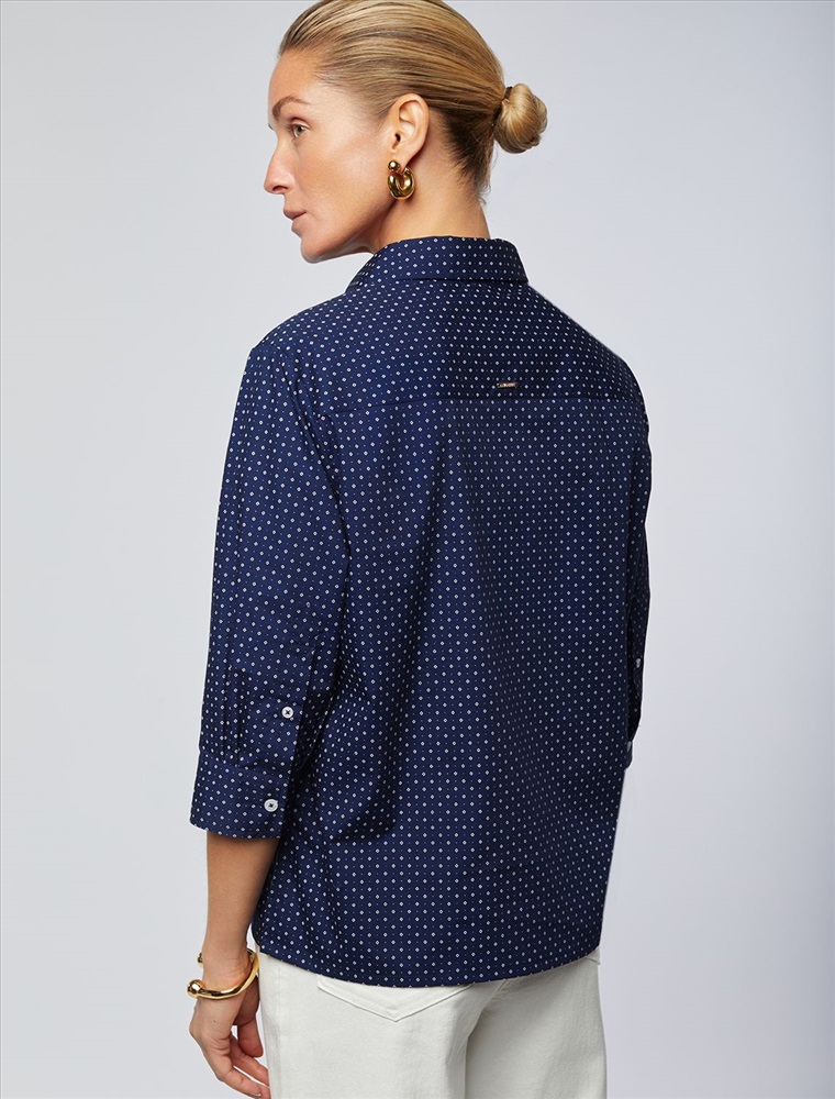 Блузка прямого кроя выполнена из хлопка. Модель с укороченным рукавом и застежкой на пуговицы из натурального перламутра. Хлопковая ткань отлично держит форму, а добавление ПЭ в составе способствует меньшей сминаемости изделия. На спинке фирменный логотип бренда золотистого цвета.