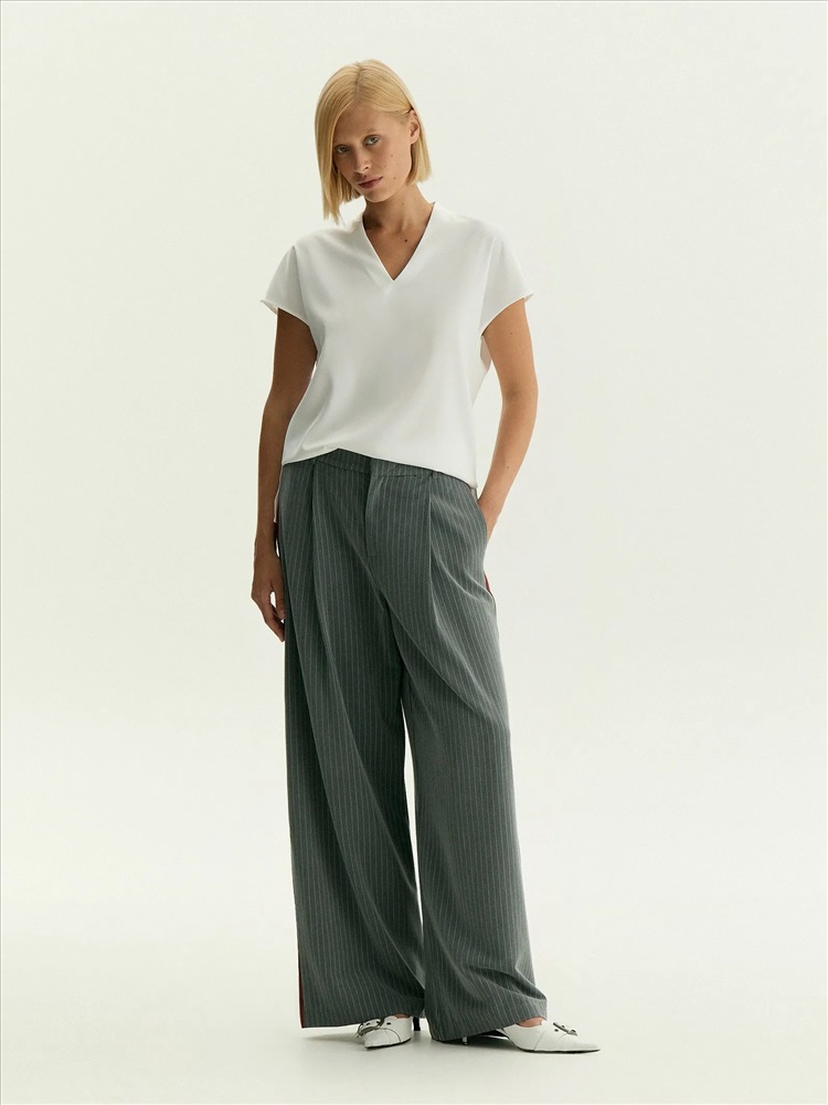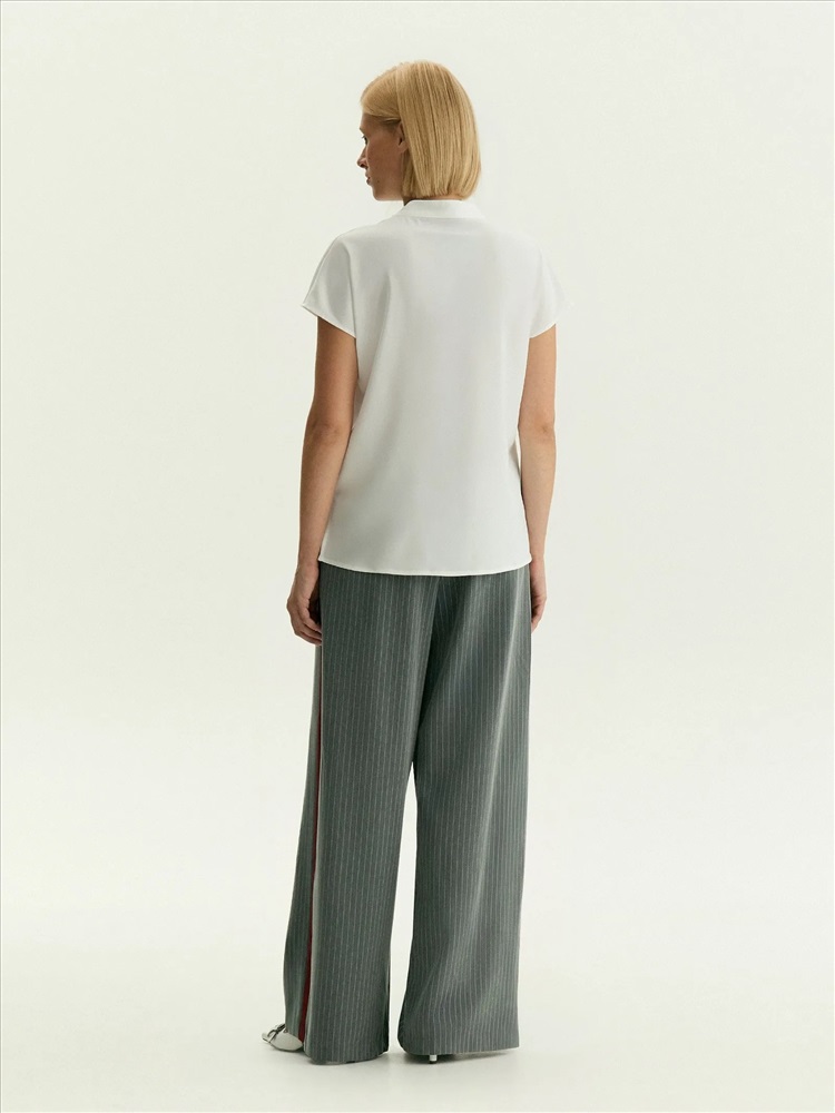 Базовая блузка в универсальном молочном цвете. Выполнена из материала с содержанием вискозы, без подкладки. Модель прямого кроя с коротким рукавом отличает элегантная стойка, переходящая в небольшой и изящный V-образный вырез. Внизу по бокам изделия располагаются аккуратные разрезы. Длина позволяет носить блузку как навыпуск, так и заправленной.
