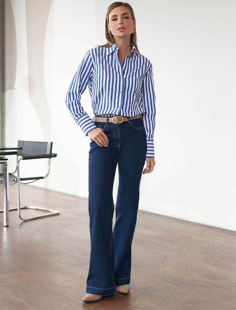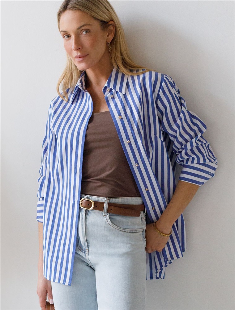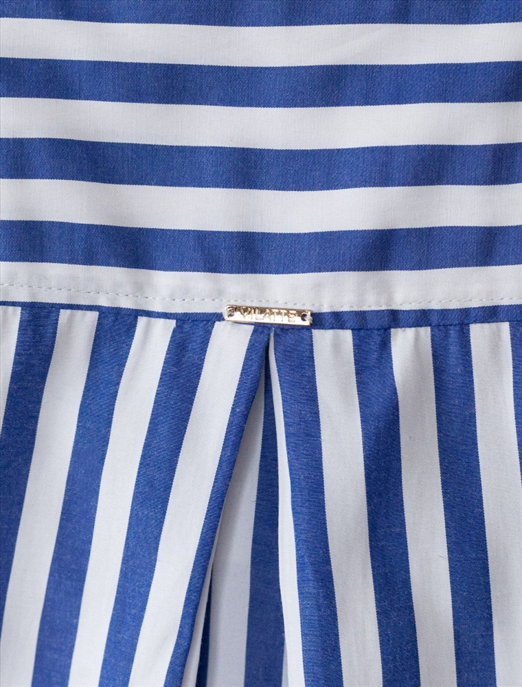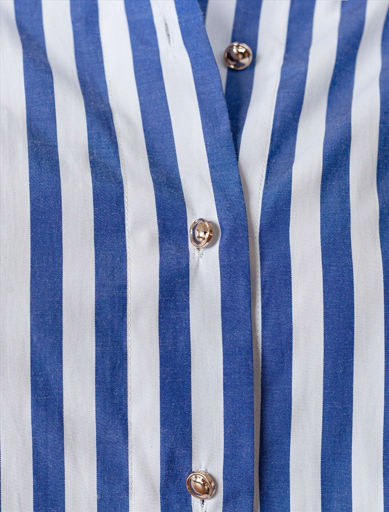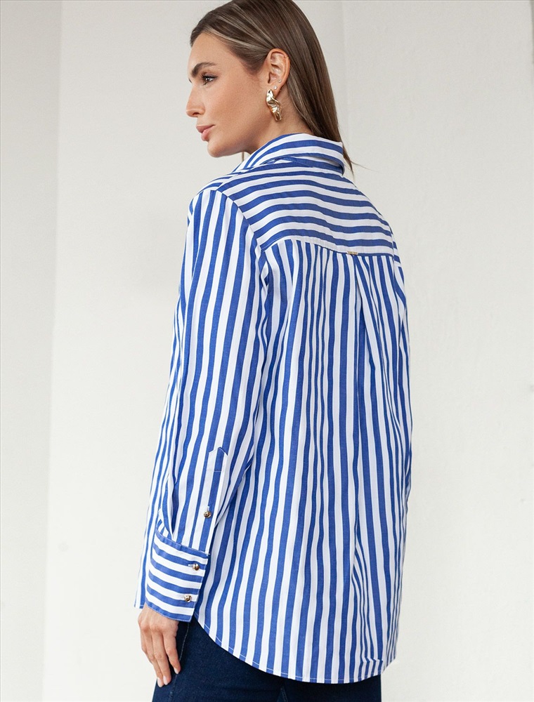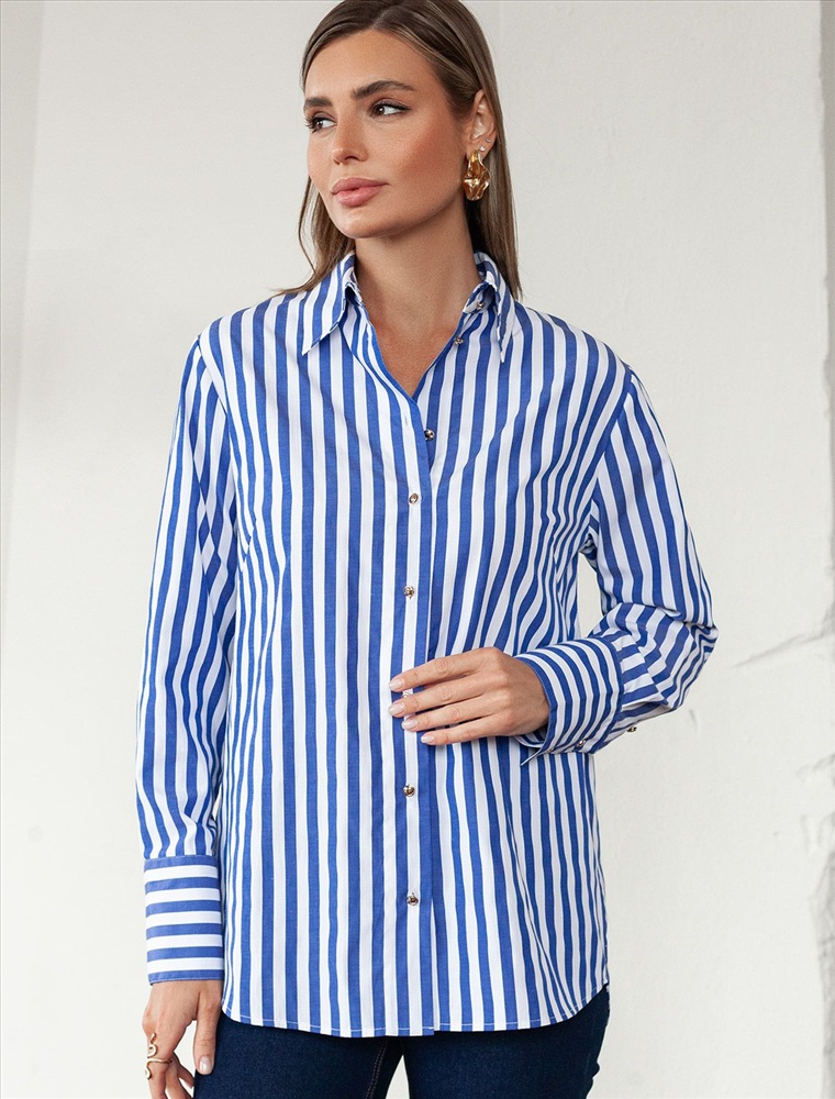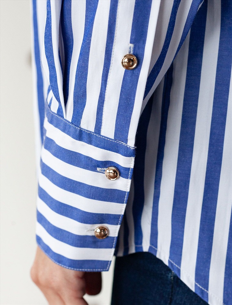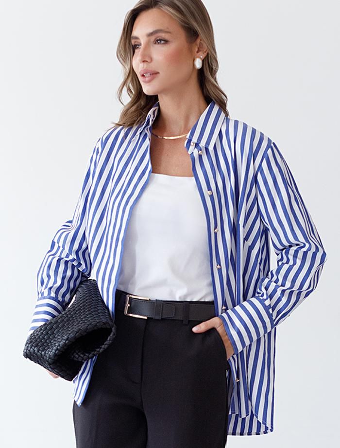 Плотность: 100 Г/м2 Параметры модели на первом фото: Рост 170, бюст 89, талия 63, бедра 92 Блузка свободного силуэта выполнена из смесовой струящейся ткани. Модель в вертикальную полоску дополнена золотистыми рельефными пуговицами. Свободный силуэт подходит для любой фигуры. Для идеального роскошного образа используйте в качестве низа брюки светлых тонов. На спинке изделия фирменный металлический логотип бренда. Комментарии к товару
