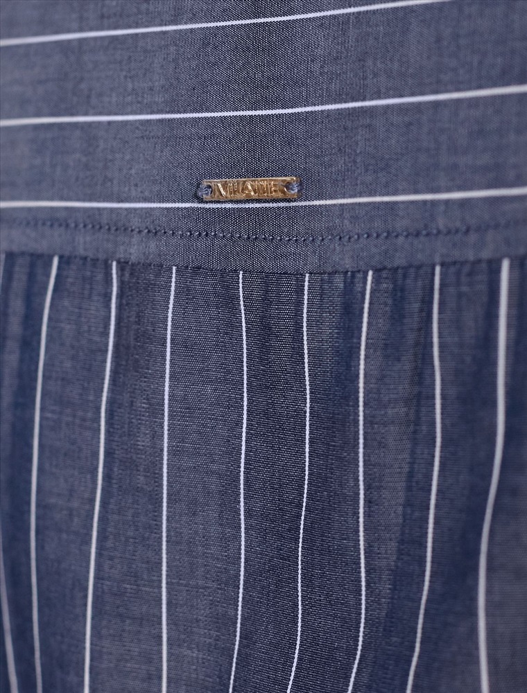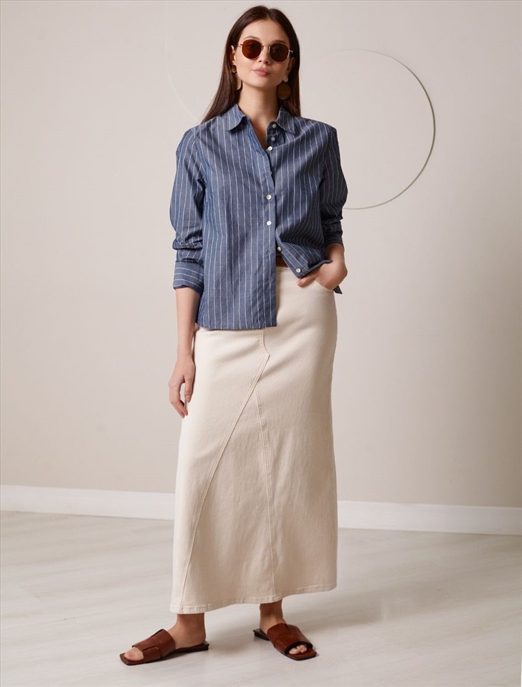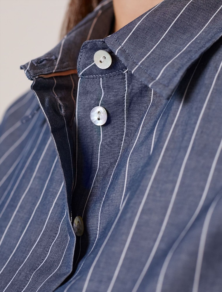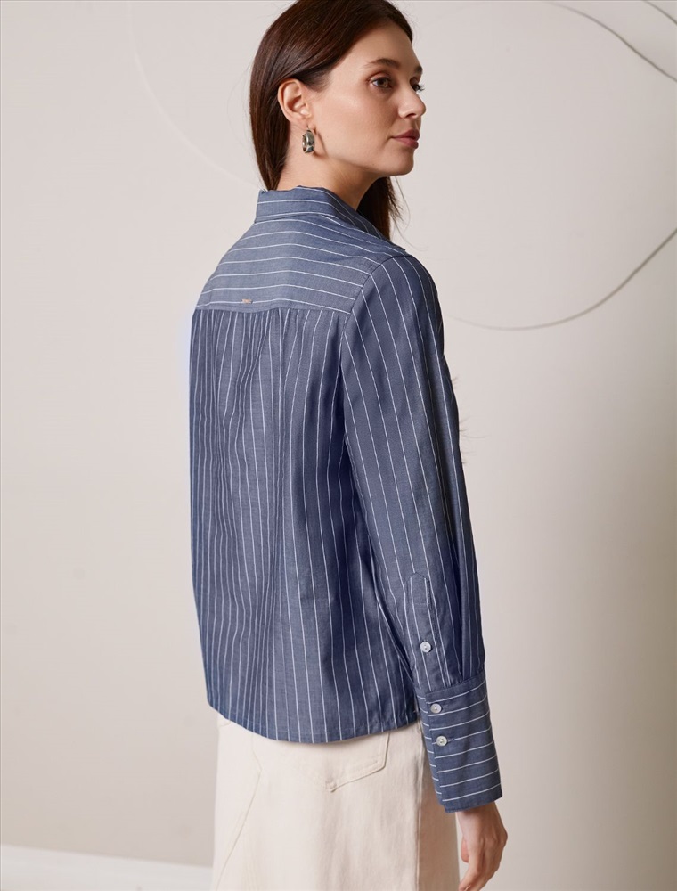 Блузка свободного силуэта серого цвета в синюю полоску из 100 % хлопка идеально подходит для теплого сезона и порадует всех, кто ценит комфорт и стиль. Натуральный материал плотностью 106 Г/м2 обеспечивает приятное ощущение на теле и хорошо пропускает воздух, что особенно важно летом и весной. Блузка с длинным рукавом обладает высокой износостойкостью, что позволяет сохранять привлекательный внешний вид даже при регулярном использовании. Ткань хорошо держит форму после стирки и надолго остается аккуратной. Классическая рубашка с отложным воротником и широкими манжетами формирует актуальный образ, подходящий как для работы, так и для повседневных прогулок. Пуговицы на планке добавляют практичности и позволяют регулировать степень открытости, что также способствует созданию различных вариантов ношения, например, в качестве второго слоя. Прямой свободный крой рубашки не сковывает движения и создает ощущение легкости, а принт в полоску делает образ выраженным, современным и подчеркивает индивидуальность. Повседневная блузка гармонично сочетается с любыми низами, что делает ее универсальной частью гардероба.