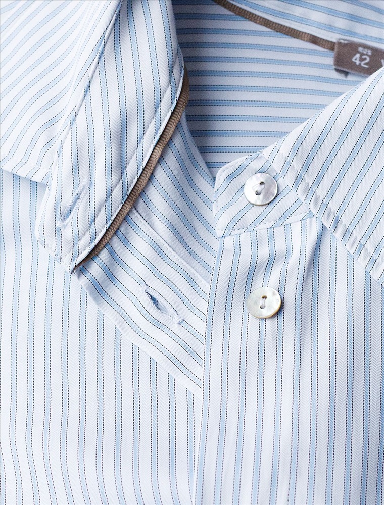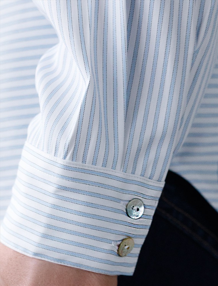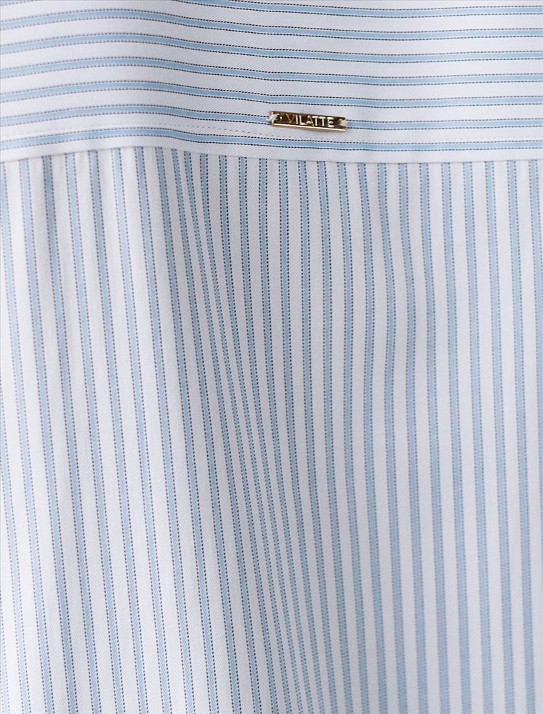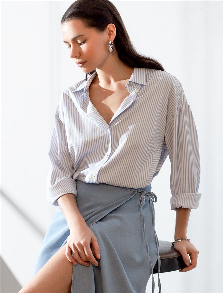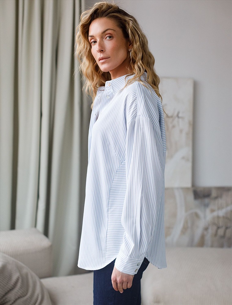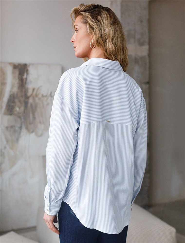 Блузка белого цвета в голубую полоску свободного силуэта отлично подходит для повседневной носки и создания стильных образов. Уникальность этой блузки в использовании техники поперечного кроя, когда некоторые детали, такие как боковые части переда, кокетка спинки и манжеты, скроены поперек. В полосатой ткани это смотрится максимально эффектно и добавляет нотки стиля кэжуал в классический образ. Такой вид полосатой ткани называется пестротканой — полосы созданы переплетением нитей разных цветов. Смешанный состав ткани идеален для деловых блузок: хлопок приятен к телу, полиэстер повышает долговечность. Свободный крой блузки и спущенная линия плеча позволяют вписать эту вещь в любой гардероб, независимо от выбранного стиля — будь то офисная атмосфера или расслабленный выход на прогулку. Отложной воротник аккуратно подчеркивает утонченную линию шеи и придает образу завершенность. Застежка на пуговицы обеспечивает комфортную регулировку и удобство в использовании. Универсальная рубашка хорошо смотрится на любые размеры, в том числе и большие, скрывает возможные недостатки и выгодно подчеркивает достоинства фигуры, подходит для работы даже в жаркое время года.