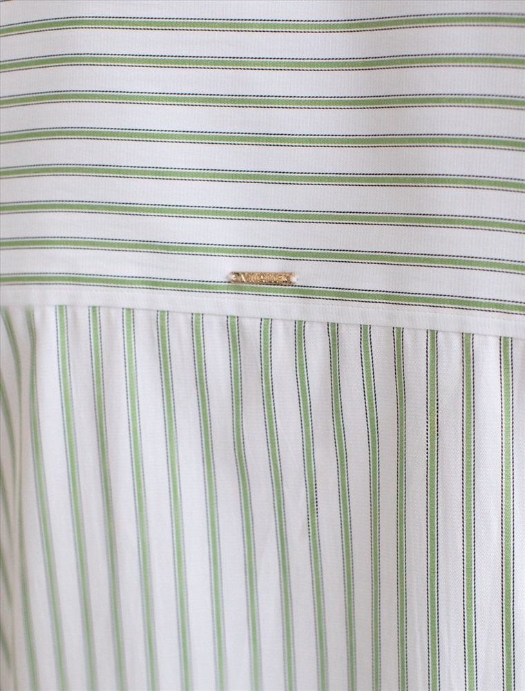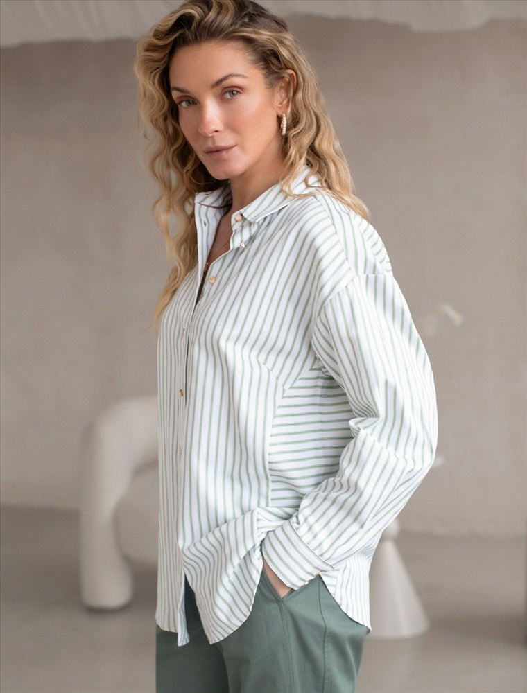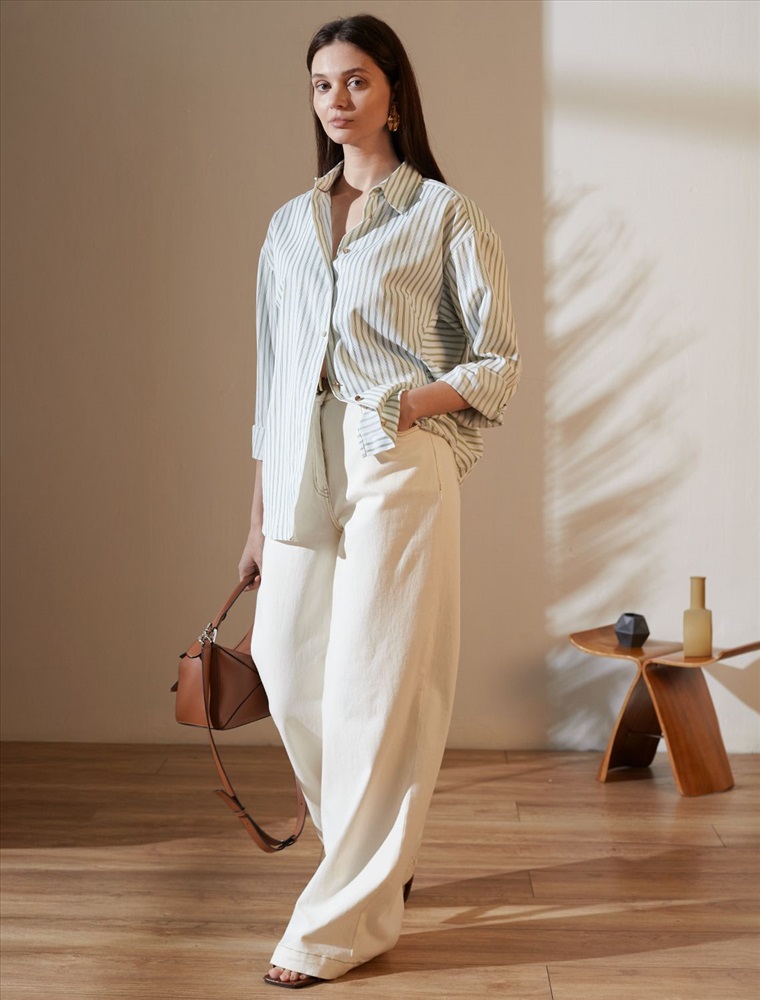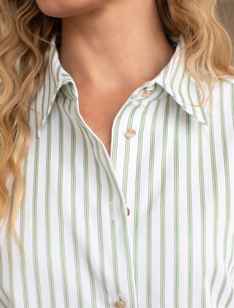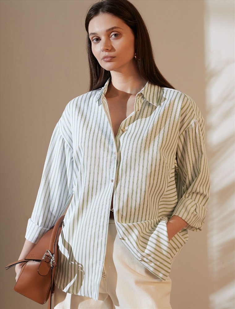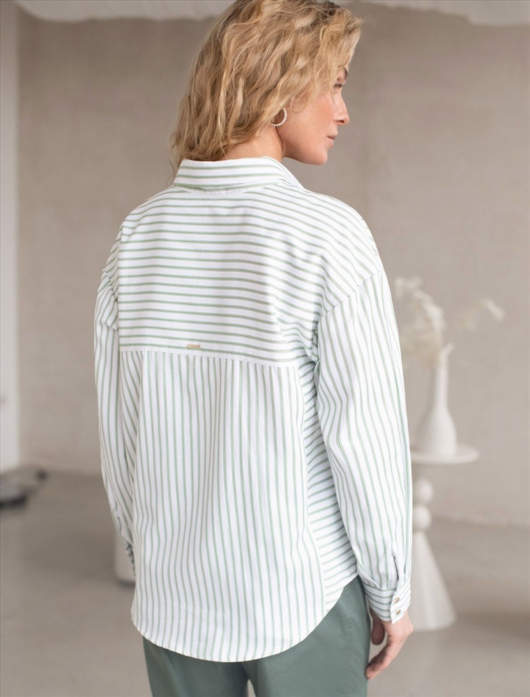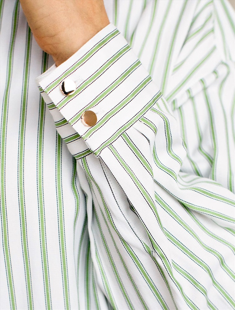Блузка белого цвета в фисташковую полоску свободного силуэта отлично подходит для повседневной носки и создания стильных образов. Уникальность этой блузки в использовании техники поперечного кроя, когда некоторые детали, такие как боковые части переда, кокетка спинки и манжеты, скроены поперек. В полосатой ткани это смотрится максимально эффектно и добавляет нотки стиля кэжуал в классический образ. Такой вид полосатой ткани называется пестротканой — полосы созданы переплетением нитей разных цветов. Смешанный состав ткани идеален для деловых блузок: хлопок приятен к телу, полиэстер повышает долговечность. Свободный крой блузки и спущенная линия плеча позволяют вписать эту вещь в любой гардероб, независимо от выбранного стиля — будь то офисная атмосфера или расслабленный выход на прогулку. Отложной воротник аккуратно подчеркивает утонченную линию шеи и придает образу завершенность. Застежка на пуговицы обеспечивает комфортную регулировку и удобство в использовании. Универсальная рубашка хорошо смотрится на любые размеры, в том числе и большие, скрывает возможные недостатки и выгодно подчеркивает достоинства фигуры, подходит для работы даже в жаркое время года.