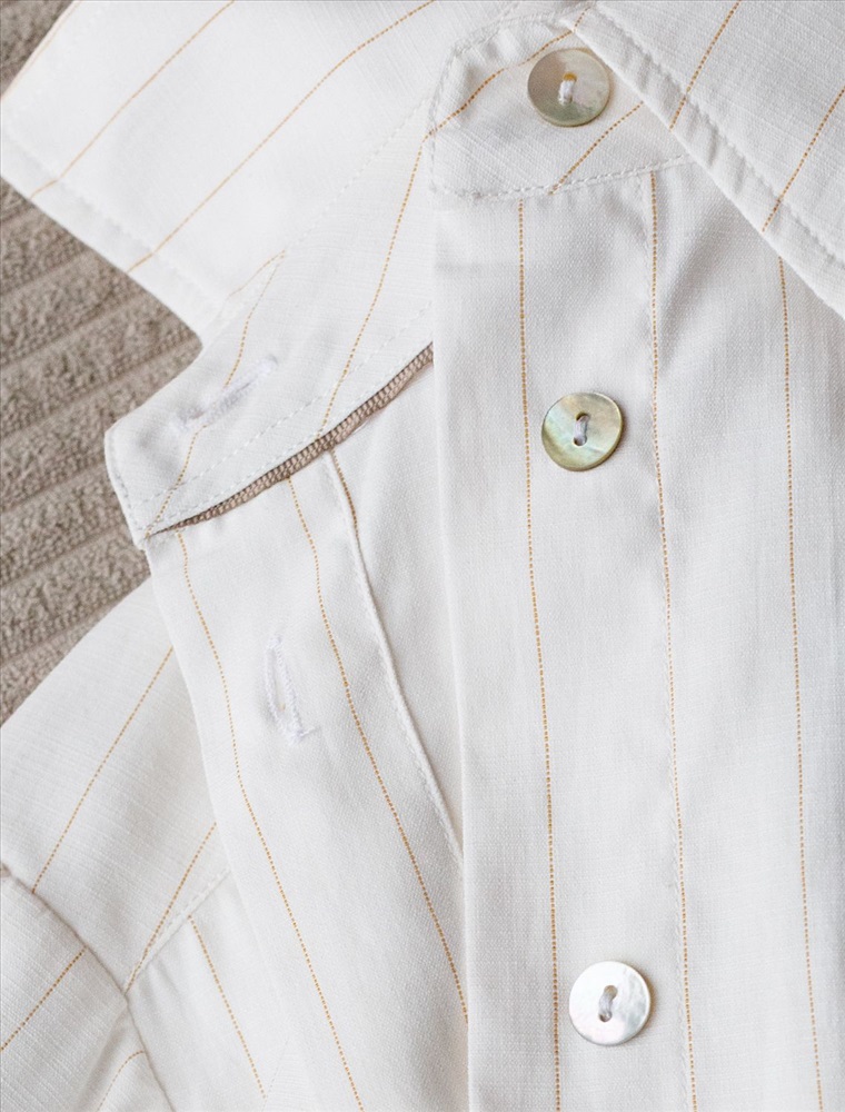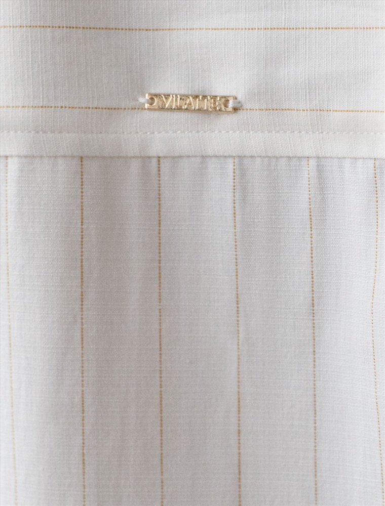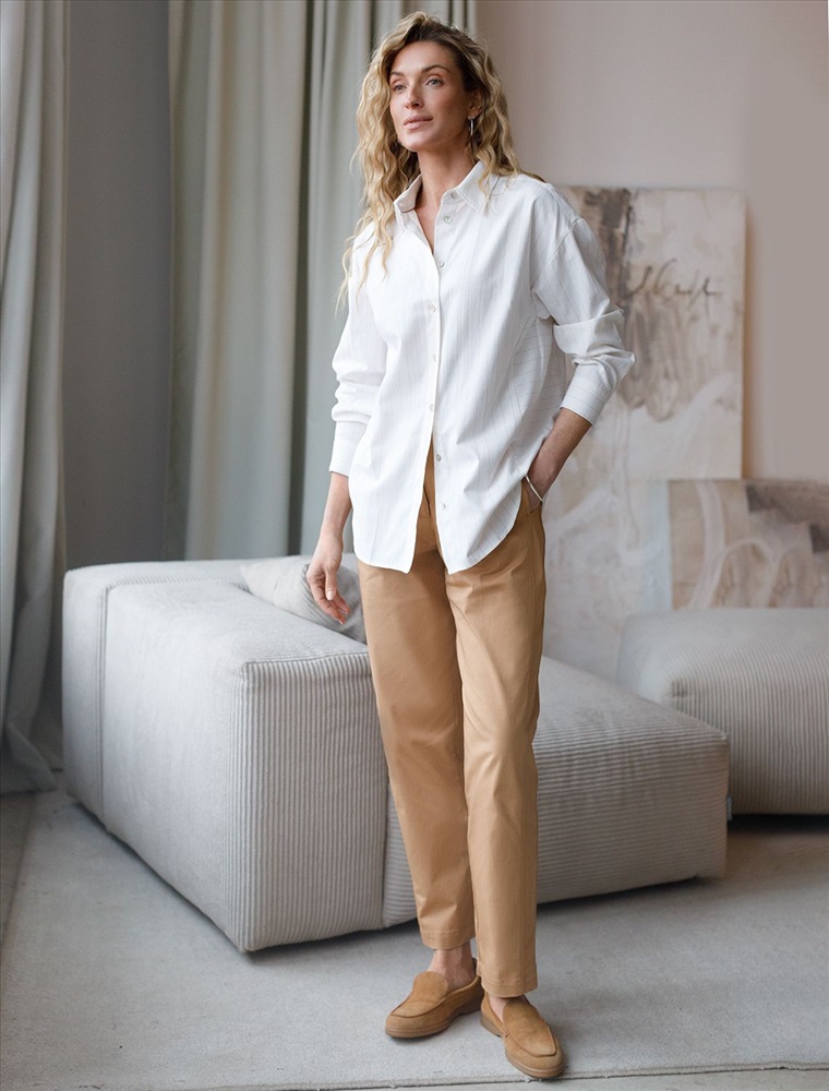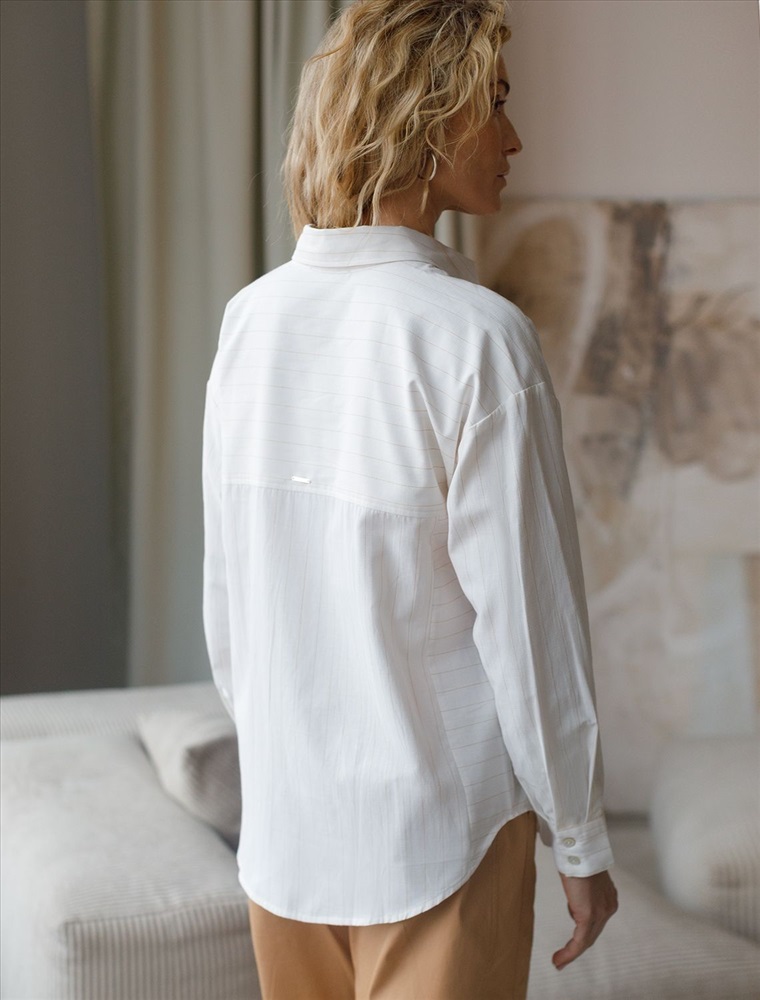 Блузка молочного цвета в бежевую полоску свободного силуэта отлично подходит для повседневной носки и создания стильных образов. Благодаря льну и хлопку ткань хорошо дышит, освежает и подходит для работы даже в жаркое время года. Натуральный материал выглядит аккуратно даже после многочисленных стирок. Рубашка отличается оверсайз фасоном, а принт в горизонтальную и вертикальную полоску подчеркивет индивидуальность и добавляет стильный акцент. Свободный крой блузки и спущенная линия плеча позволяют вписать эту вещь в любой гардероб, независимо от выбранного стиля — будь то офисная атмосфера или расслабленный выход на прогулку. Отложной воротник аккуратно подчеркивает утонченную линию шеи и придает образу завершенность. Застежка на пуговицы обеспечивает комфортную регулировку и удобство в использовании. Универсальная рубашка хорошо смотрится на любые размеры, в том числе и большие, скрывает возможные недостатки и выгодно подчеркивает достоинства фигуры.