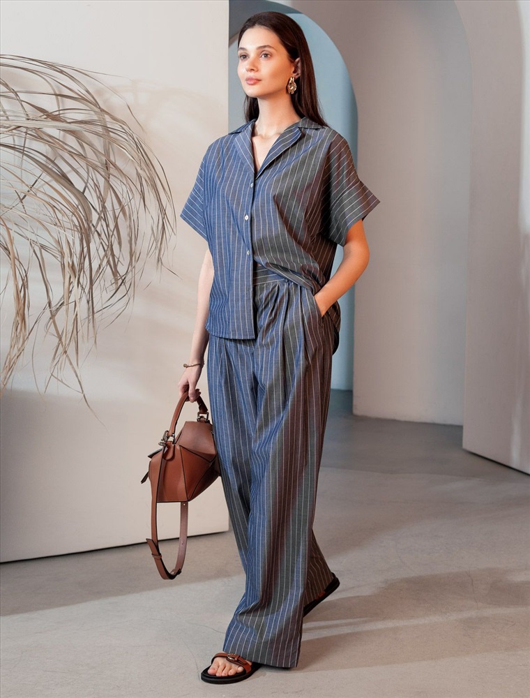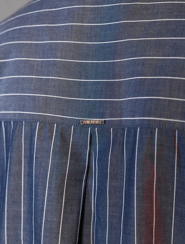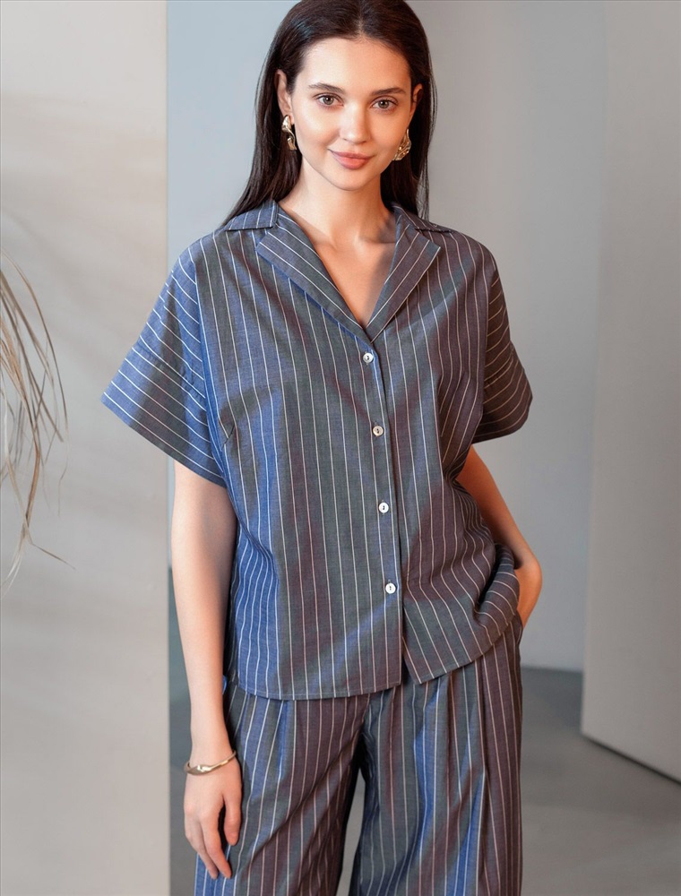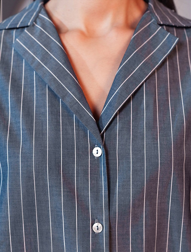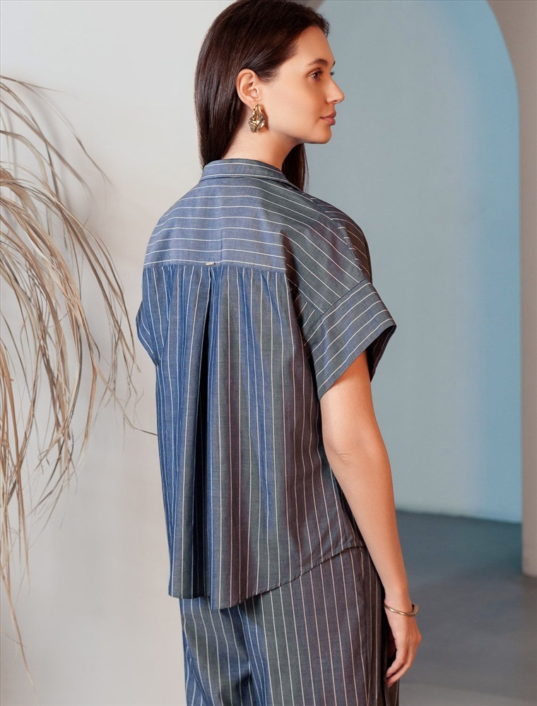 Стильная блузка серо-синего цвета в полоску с коротким рукавом выполнена из легкого хлопкового поплина плостностью 106 Г/м2. Летняя модель идеально подходит на теплое время года и жаркую погоду. Натуральный состав ткани обладает высокой воздухопроницаемостью, а также способностью поглощать и отдавать влагу. В повседневной свободной блузке будет очень комфортно, благодаря правильной регуляции температуры тела. Удачнный крой, отложной воротничок и принт в полоску визуально вытяговают силуэт и помогают скрывать возможные недостатки фигуры. Цельнокроеные короткие рукава добавляют удобства и легкости, оставляя комфорт на высшем уровне. Такая рубашка отлично впишется в деловой гардероб и подчеркнет вашу уверенность на любом мероприятии. Этот фасон выделяется своей универсальностью, позволяя легко создавать образы для разных ситуаций. Если хотите выглядеть стильно и при этом чувствовать себя комфортно, этот выбор будет идеальным решением.