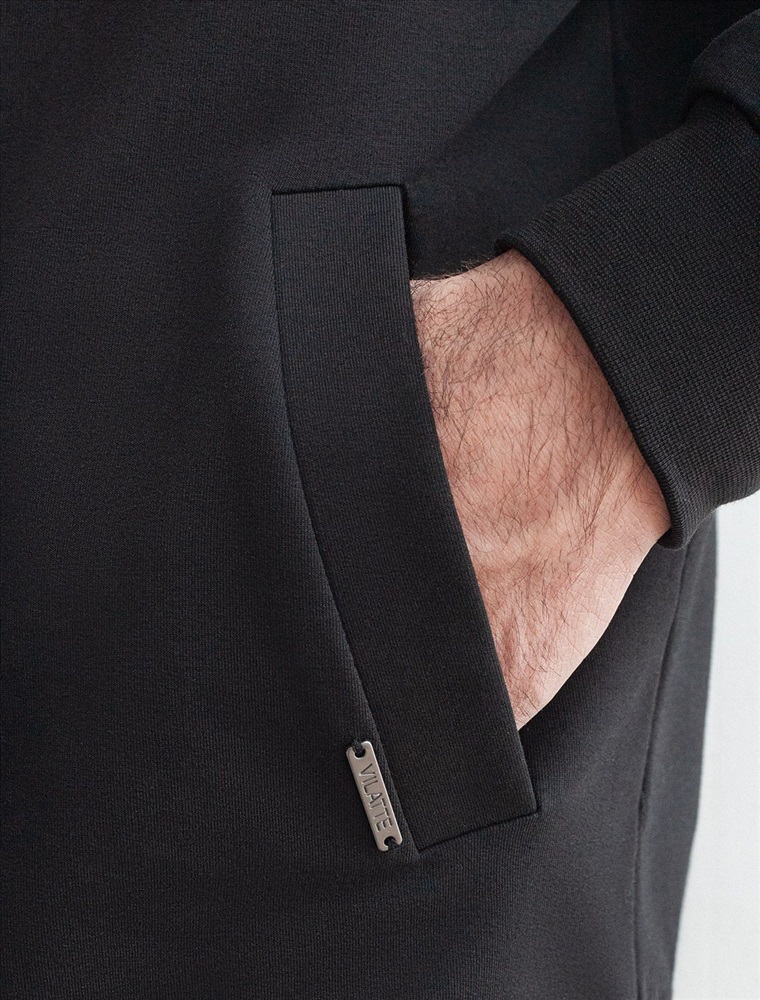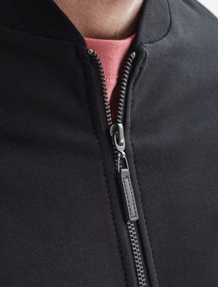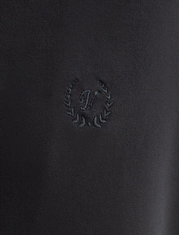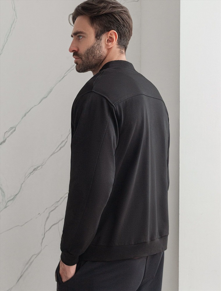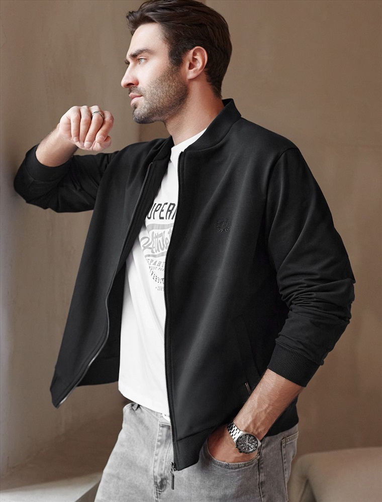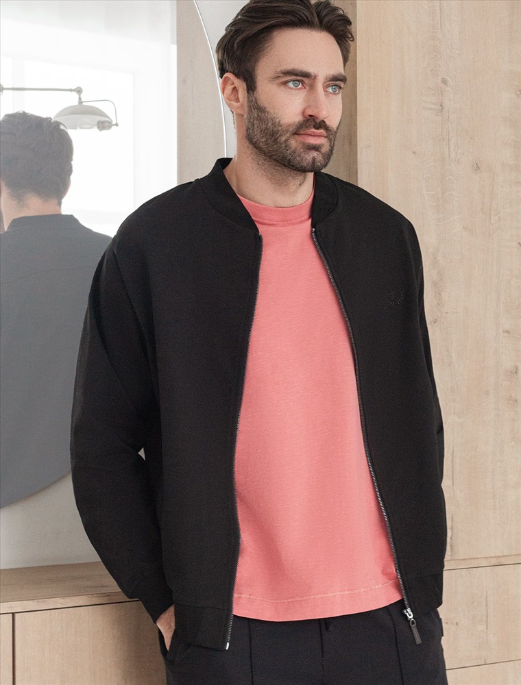 Бомбер выполнен из футера двухнитки с эластаном. Застежка на молнию с наконечником из эко-кожи. Спереди лаконичная вышивка с буквой V в тон изделия. Модель дополнена карманами и фирменным металлическим логотипом бренда. Сочетается в костюме с брюками U44.005