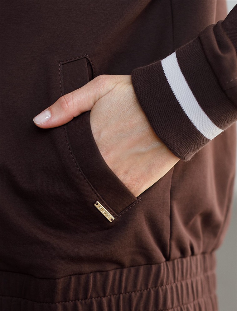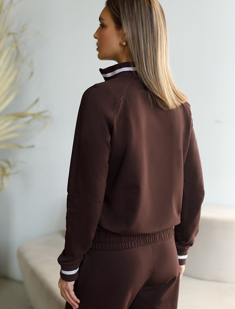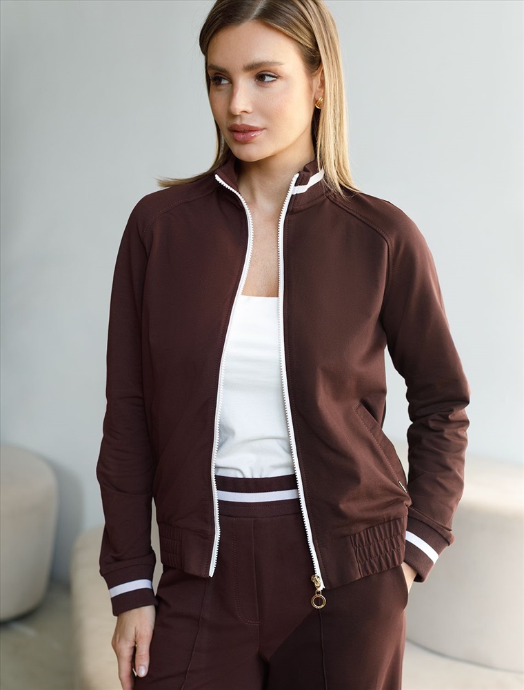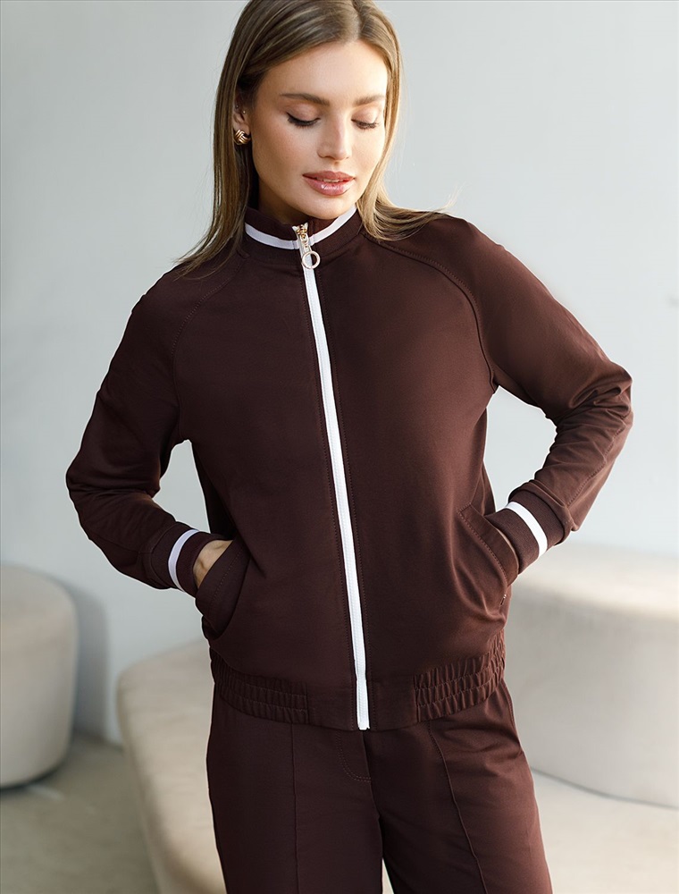 Плотность: 240 Г/м2 Бомбер коричневого цвета среднего объема с застежкой на молнию выполнен из премиального футера двухнитки плотностью 240 Г/м2. Натуральный состав ткани обеспечивает дышащий эффект, мягкость и приятные тактильные ощущения, Эластичный материал позволяет свободно двигаться без стеснения, а также отлично сохраняет форму даже после длительного ношения. Гладкая лицевая сторона придает бомберу опрятный и дорогой вид. Повседневный бомбер отличается аккуратным силуэтом без лишнего объема и универсальной длиной, которая идеально подходит для повседневного образа. Манжеты на рукавах и широкая резинка по низу обеспечивают надежную посадку, сохраняя тепло в прохладную летнюю погоду. Особенность бомбера - контрастные канты на горловине и манжетах, которые добавляют современный акцент и делают его более выразительным. Представленная размерная линейка позволяет подобрать оптимальный вариант для любой фигуры и размера, на маленький или плюс сайз, обеспечивая свободу движений без компромиссов по стилю. Этот легкий бомбер станет отличным дополнением к базовому или спортивному гардеробу, сочетая практичность и стиль. Рекомендуем сочетать с артикулами: D44.168, D44.165
