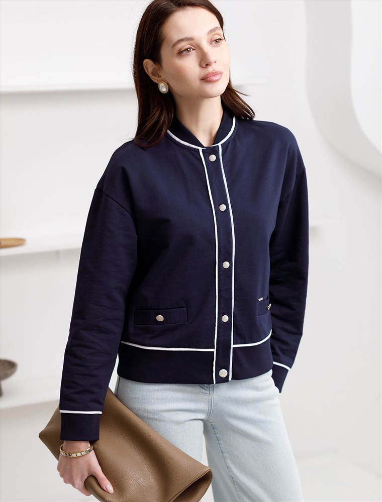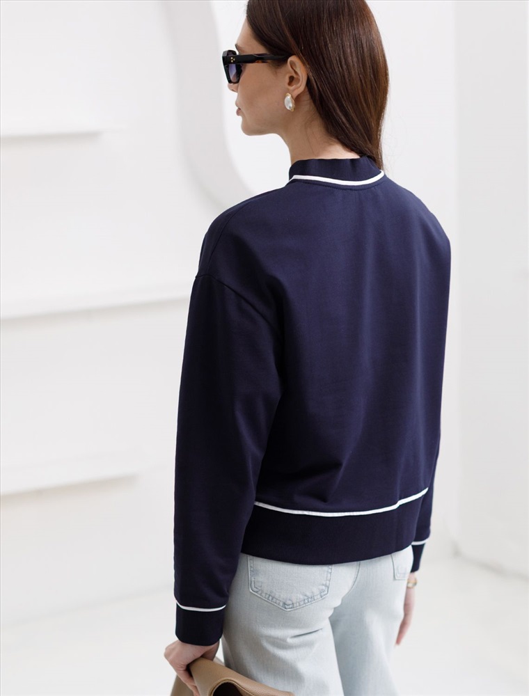 Плотность: 240 Г/м2 Бомбер темно-синего цвета среднего объема с застежкой на пуговицы выполнен из премиального футера двухнитки плотностью 240 Г/м2. Натуральный состав ткани обеспечивает дышащий эффект, мягкость и приятные тактильные ощущения, Эластичный материал позволяет свободно двигаться без стеснения, а также отлично сохраняет форму даже после длительного ношения. Гладкая лицевая сторона придает бомберу опрятный и дорогой вид. Повседневный бомбер отличается аккуратным силуэтом без лишнего объема и универсальной длиной, которая идеально подходит для повседневного образа. Особенность бомбера - контрастные канты на горловине, манжетах, поясе и вдоль застежки, которые добавляют современный акцент и делают его более выразительным. Представленная размерная линейка позволяет подобрать оптимальный вариант для любой фигуры и размера, на маленький или плюс сайз, обеспечивая свободу движений без компромиссов по стилю. Этот легкий бомбер станет отличным дополнением к базовому гардеробу, сочетая практичность с элегантностью. Рекомендуем сочетать с артикулами: D44.168, D46.059