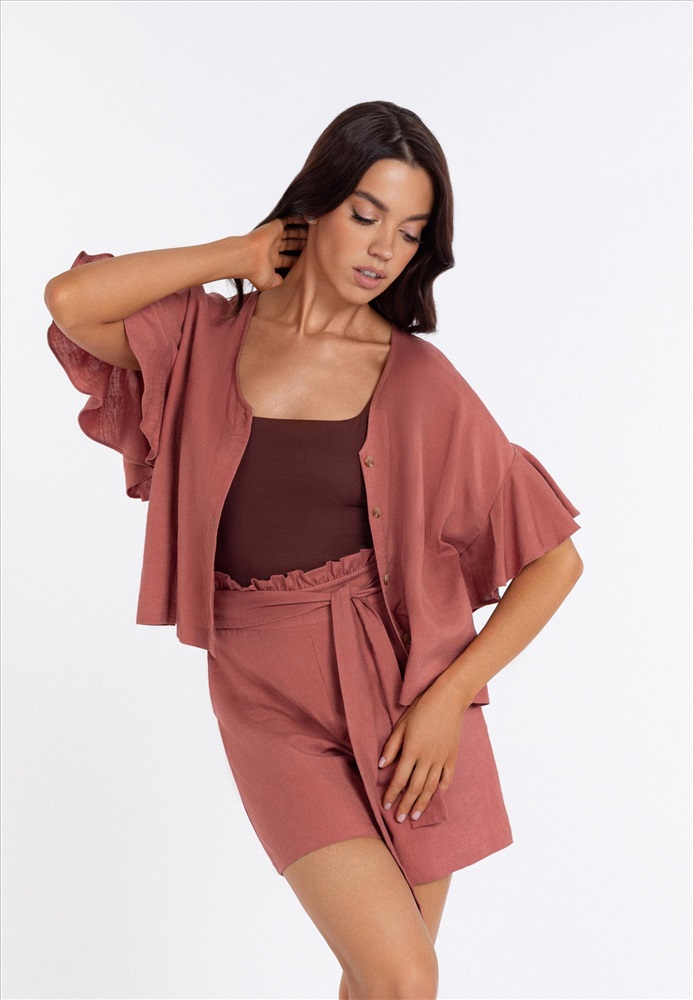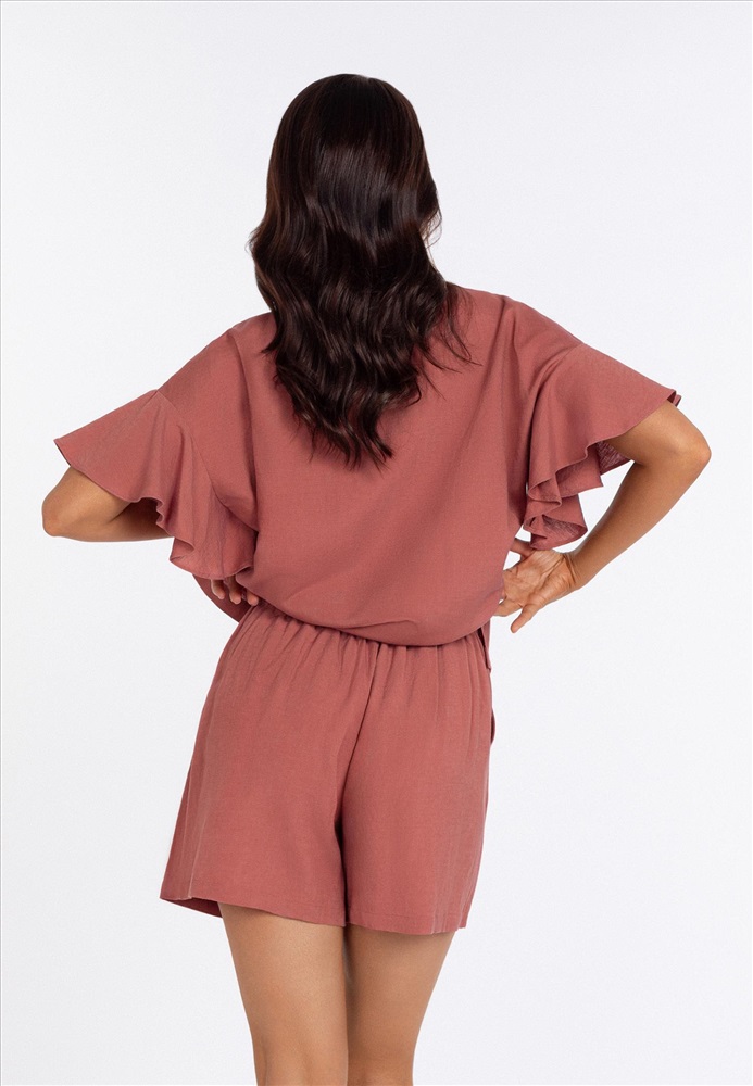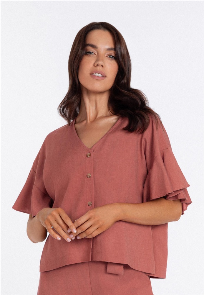 Блуза прямого кроя на пуговицах. V-образный вырез декольте. По бокам короткие разрезы. Рукав со спущенной проймой, отделка воланами.