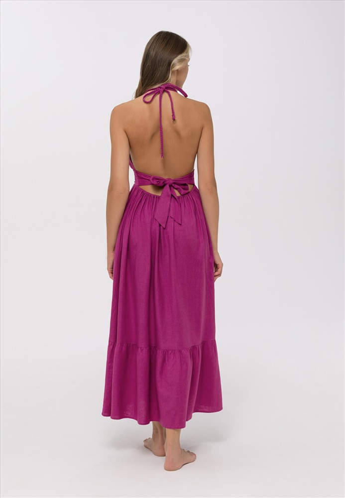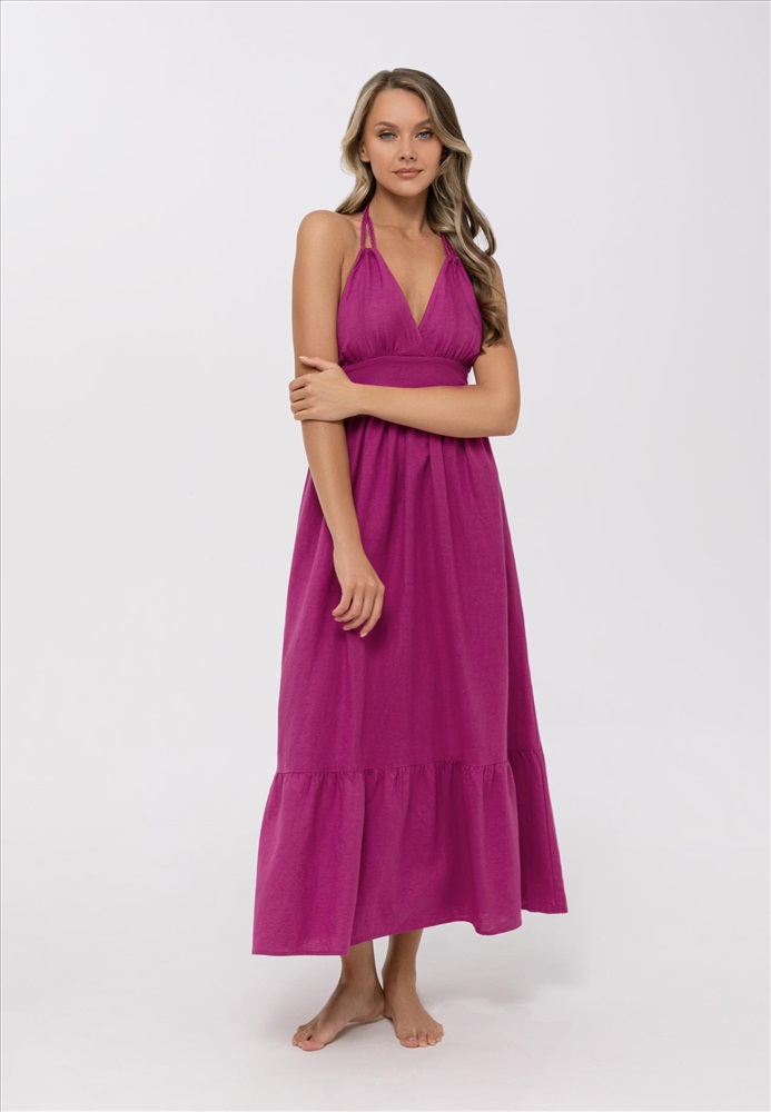 Длинный сарафан полуприлегающего силуэта из льна и вискозы. Боковые карманы. Плетенные бретели-спагетти вокруг шеи. Объем под грудью регулируется широким поясом с завязкой на спине.