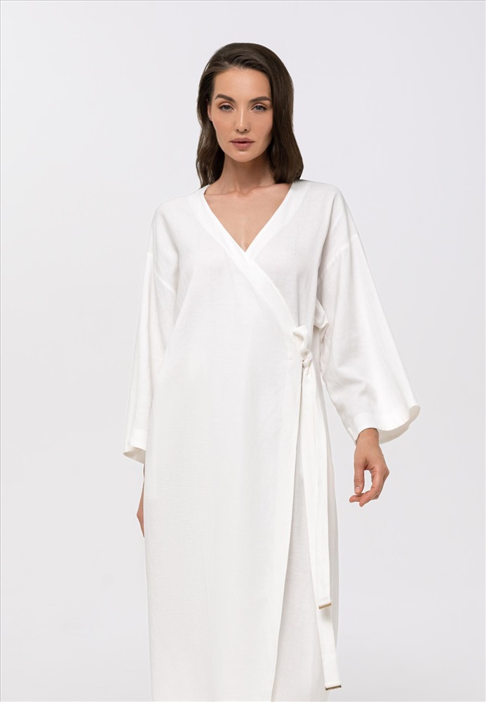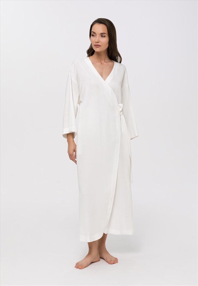 Кимоно свободного кроя из льна и вискозы на запах. Боковые карманы. Втачной рукав 3/4. Длина ниже уровня колен.