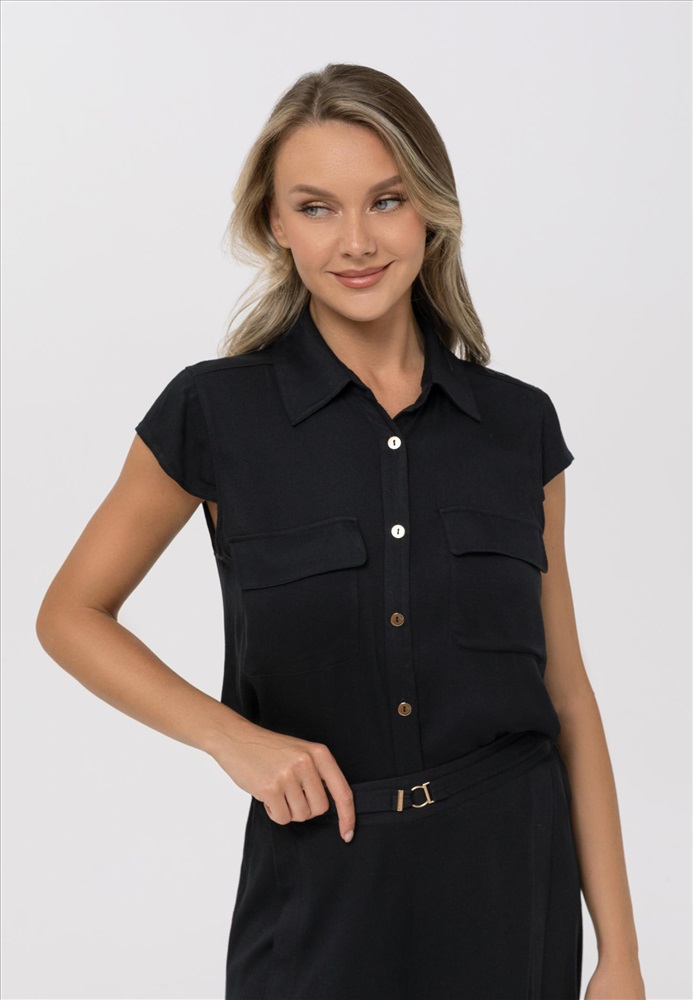 Блуза на пуговицах с короткими рукавами-крылышками. Спереди накладные карманы.