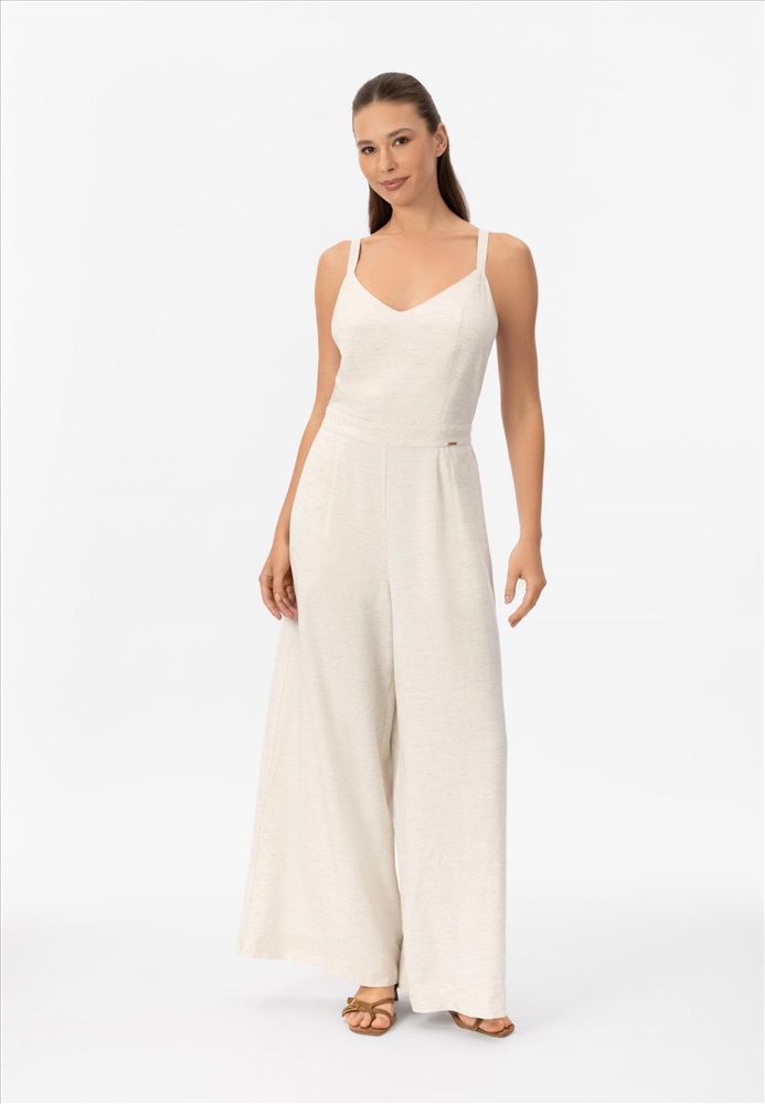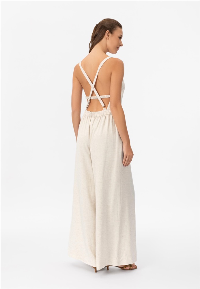 Комбинезон изо льна и вискозы. V-образная линия декольте. Брюки, слегка расклешенные книзу. Боковые карманы. Открытая спина. Вырез на спине фиксируется эластичной лентой. Регулируемые бретели крепятся на спине крест-накрест.