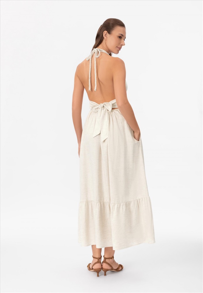 Длинный сарафан полуприлегающего силуэта изо льна и вискозы. Боковые карманы. Плетеные бретели-спагетти вокруг шеи. Объем под грудью регулируется широким поясом с завязкой на спине.