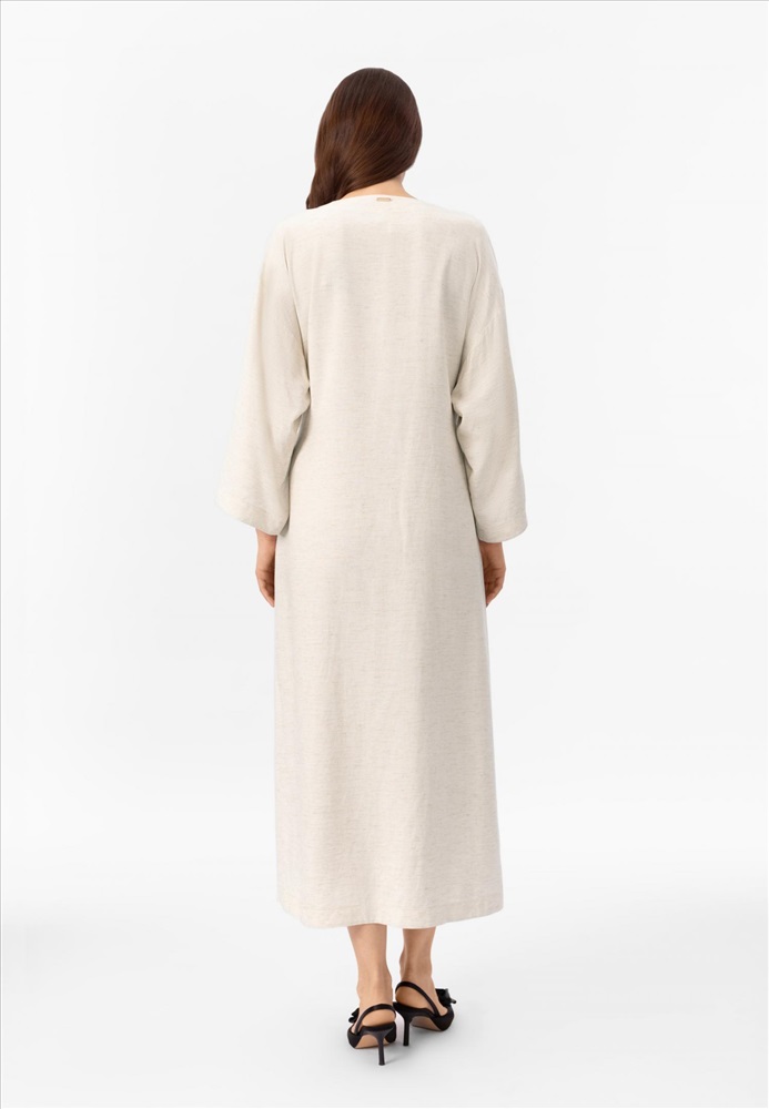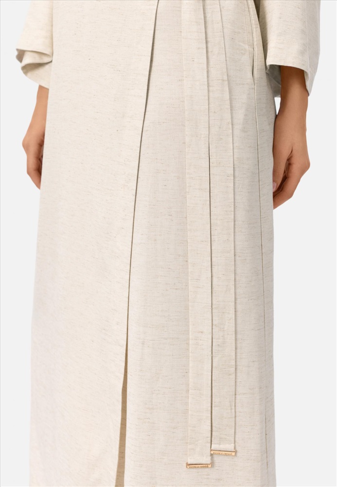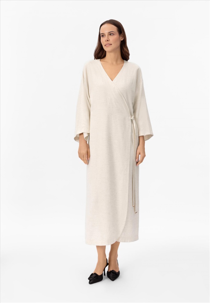 Кимоно свободного кроя изо льна и вискозы на запах. Боковые карманы. Спущенное плечо, заниженная пройма. Втачной рукав 3/4. Длина ниже уровня колен.