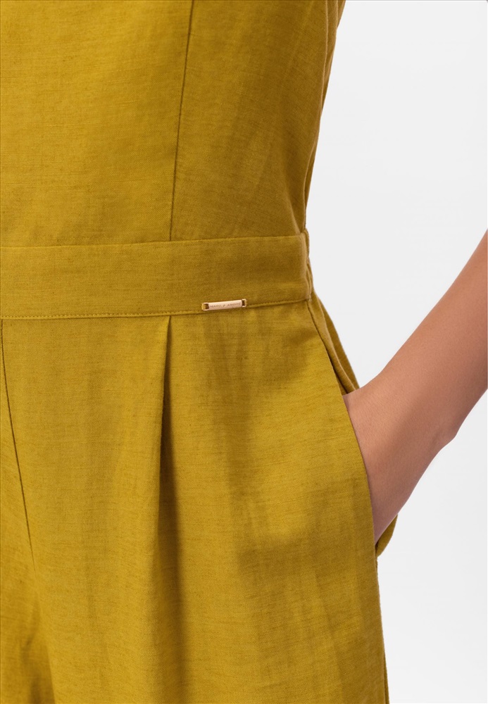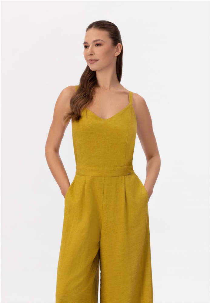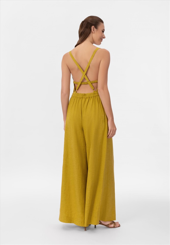 Комбинезон изо льна и вискозы. V-образная линия декольте. Брюки, слегка расклешенные книзу. Боковые карманы. Открытая спина. Вырез на спине фиксируется эластичной лентой. Регулируемые бретели крепятся на спине крест-накрест.