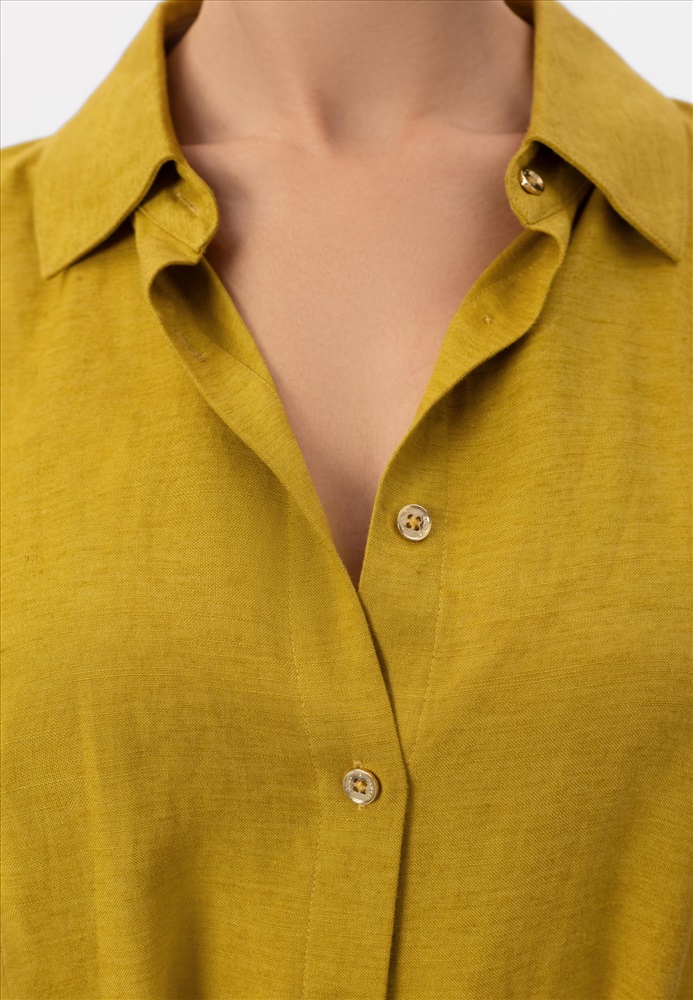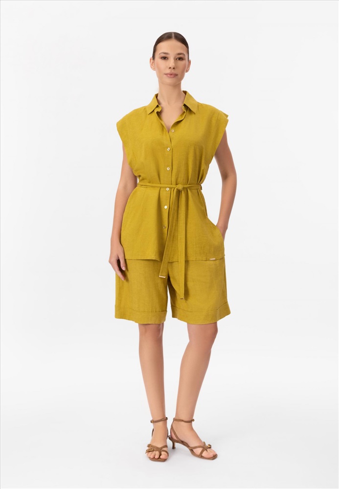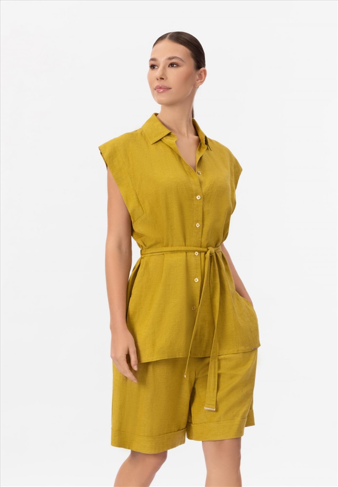 Рубашка изо льна и вискозы без рукавов, на пуговицах. Боковые разрезы. Стояче-отложной воротник. Съемный пояс.