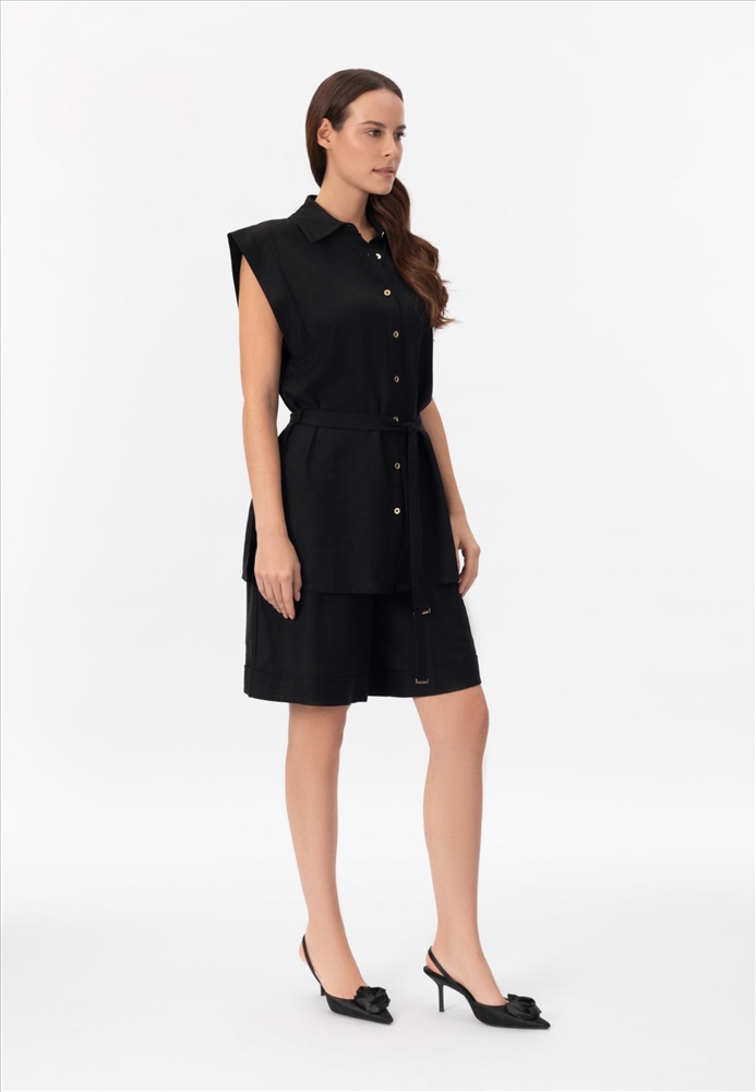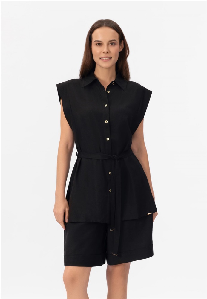 Рубашка изо льна и вискозы без рукавов, на пуговицах. Боковые разрезы. Стояче-отложной воротник. Съемный пояс.