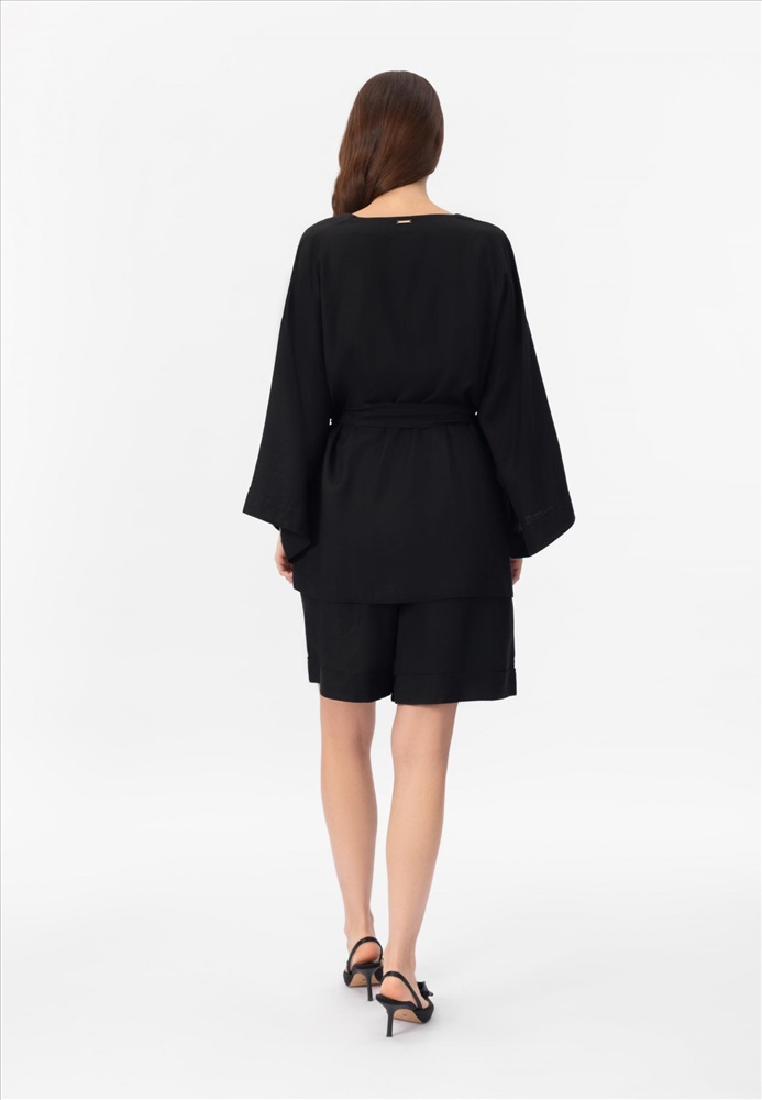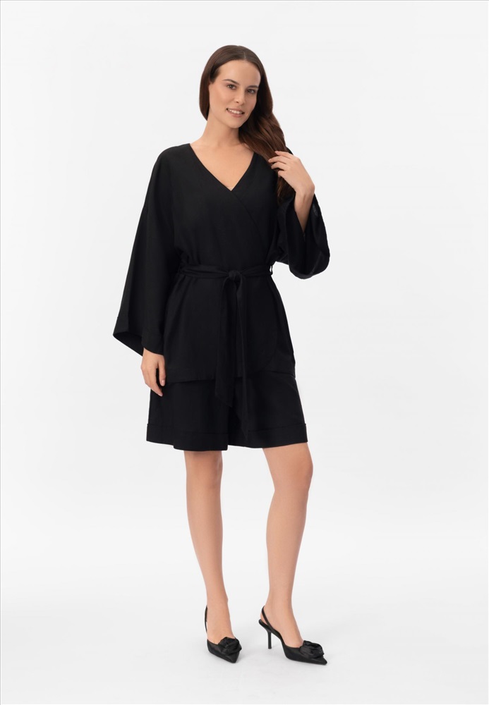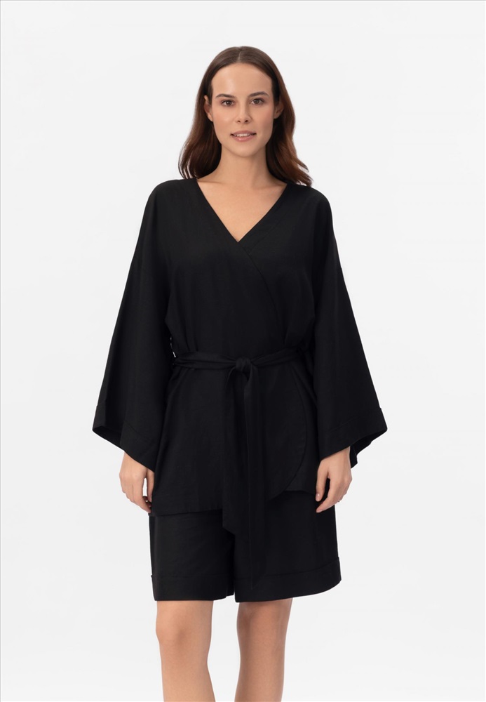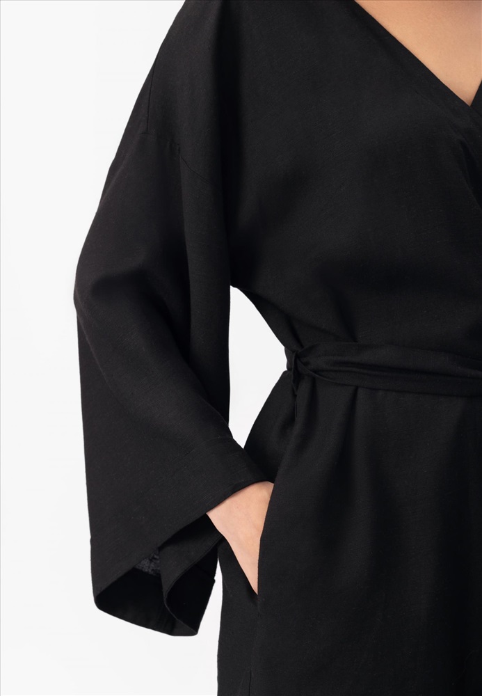 Укороченное кимоно свободного кроя изо льна и вискозы на запах. Боковые карманы. Спущенное плечо, заниженная пройма. Втачной рукав 3/4. Длина до середины бедра.