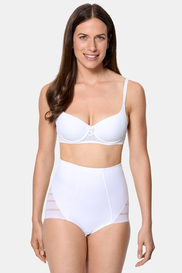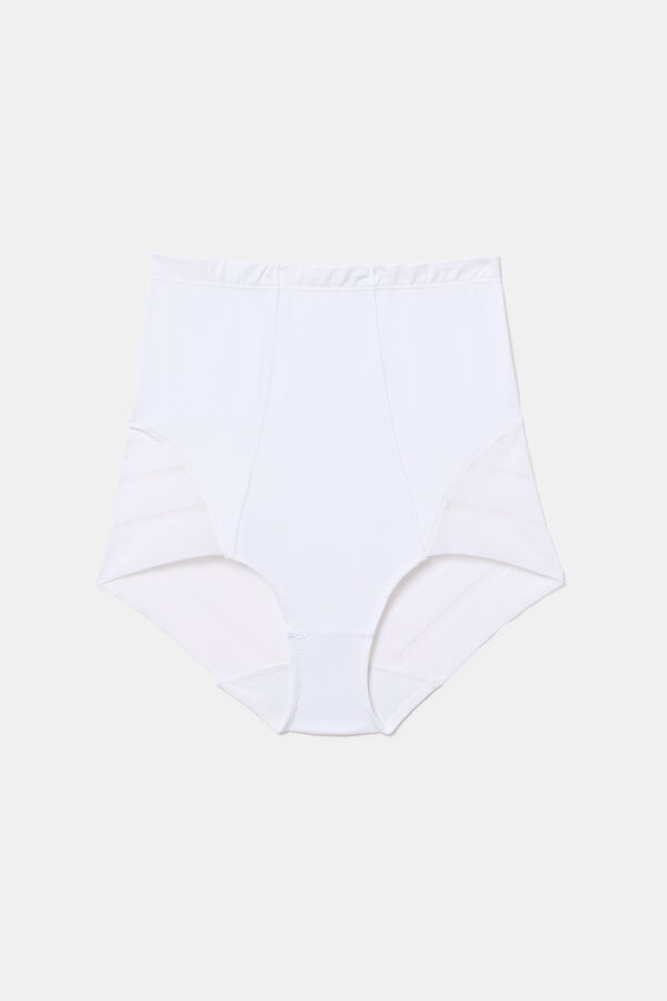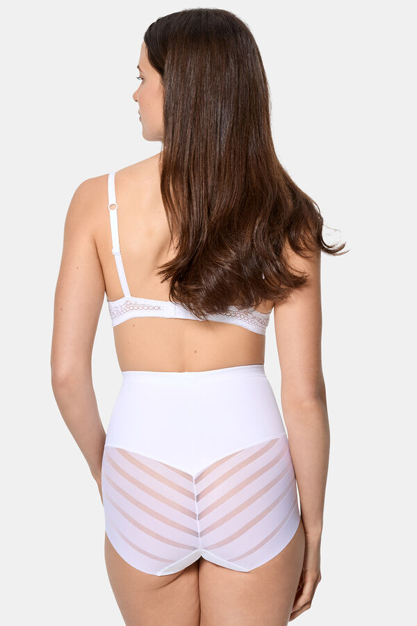 Culotte de talle alto con un nivel de contención fuerte en microfibra satinada. Laterales y parte trasera de tul gráfico con efecto de control.