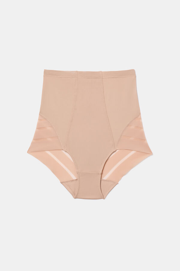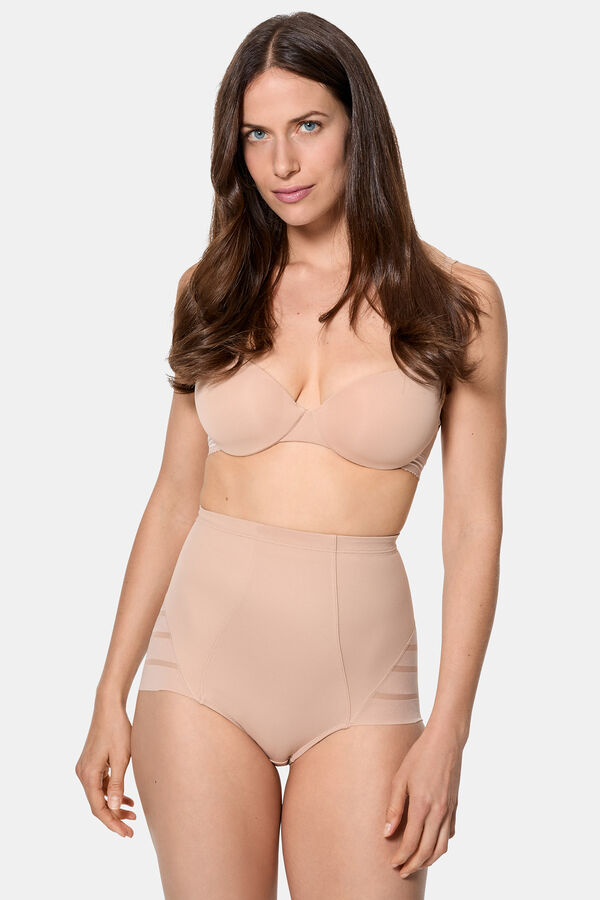 Culotte de talle alto con un nivel de contención fuerte en microfibra satinada. Laterales y parte trasera de tul gráfico con efecto de control.