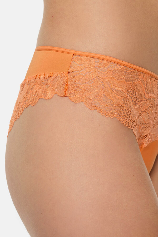 Braga de encaje a juego con el sujetador de la Línea Generous Essentiel. El encaje en la parte delantera y trasera ayuda a que no sea necesario tener terminaciones con costuras, lo que evita que aparezcan marcas bajo la ropa en los muslos. Microfibra gruesa y elástica. Elástico plano con costuras recubiertas.