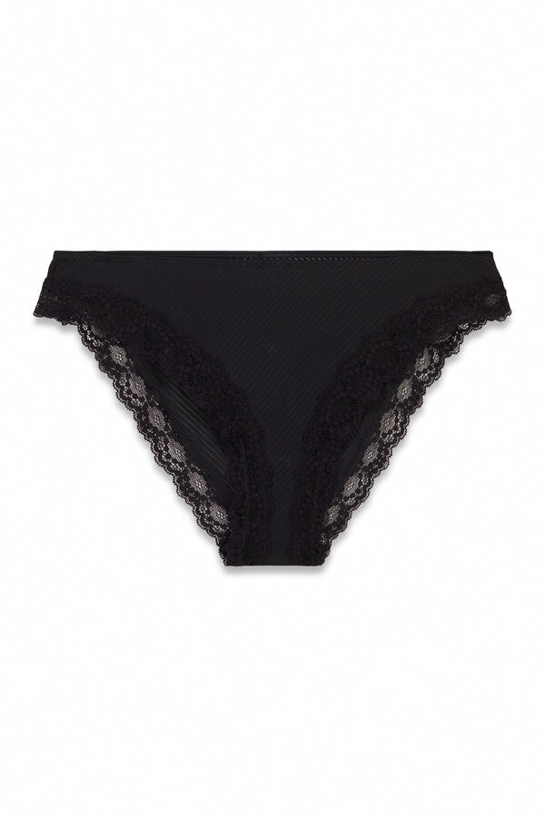 Braga clásica confeccionada en microfibra rayada con detalle de puntilla de encaje. Un toque romántico y delicado en una pieza de diseño especial.