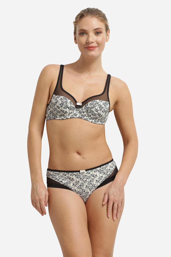 Braga clásica de suave microfibra con corte moderno que se adapta al cuerpo con ligereza y confort. Incorpora detalles en tul tanto en la parte delantera como trasera, favoreciendo un acabado invisible bajo la ropa y aportando un toque delicado. Cuenta con entrepierna de algodón para mayor comodidad y transpirabilidad en el uso diario.