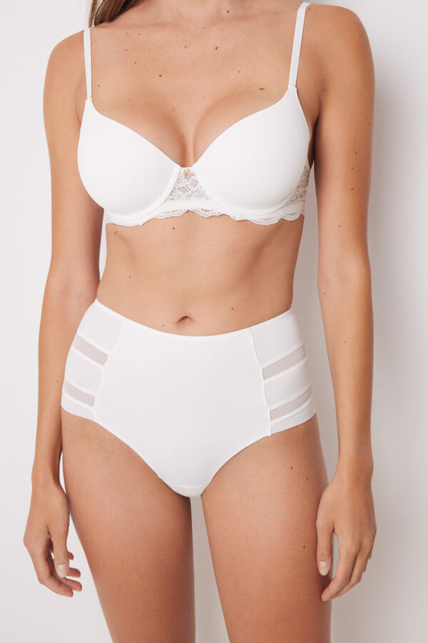 Esta braga alta, confeccionada en microfibra, realza y estiliza tu cuerpo con tejidos suaves de la más alta calidad. Una Braga semi moldeadora que muestra lo mejor de ti en un clásico color blanco. Con detalles en tul en los laterales, es todo un 'must' en tu cajón de la ropa interior.