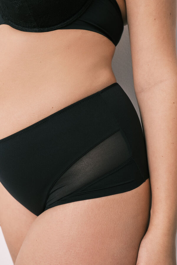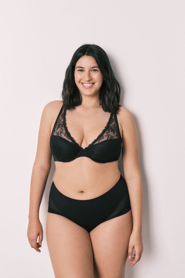 Braga alta de control semi-moldeadora con efecto reductor, forro de tul en el delantero y detalle de trasparencias en tul en los laterales. Estiliza tu silueta y es perfecta para llevar bajo las prendas que más se ciñen al cuerpo. Combina con la parte de arriba que más te guste.