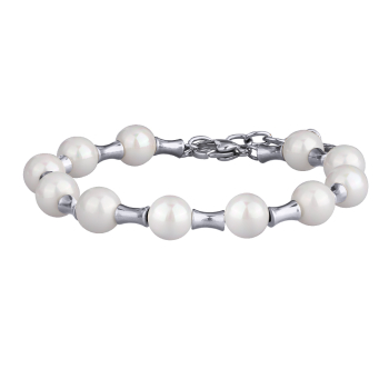 Изготовлено из ювелирного сплава на основе латуни с гальваническим покрытием родием. Изделие украшает майорский круглый жемчуг белого цвета диаметром 8мм. Длина 17см. Замок-карабин с удлинителем 3см.