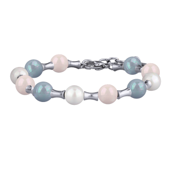 Изготовлено из ювелирного сплава на основе латуни с гальваническим покрытием родием. Изделие украшает майорский круглый жемчуг белого, розового и голубого цвета диаметром 8мм. Длина 17см. Замок-карабин с удлинителем 3см.