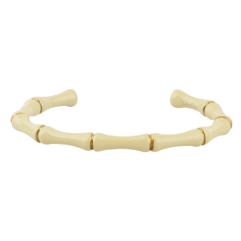 Изготовлено из ювелирного сплава на основе латуни с гальваническим покрытием золотом. Изделие украшает эмаль цвета сливочного масла. Ширина 6мм.