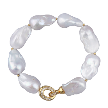 Изготовлено из ювелирного сплава на основе латуни с гальваническим покрытием золотом. Колье выполнено из натурального белого барочного жемчуга диаметром 15-25мм и фианитов белого цвета. Длина 21см. *Цвет и форма жемчужин может отличаться от изображенной н