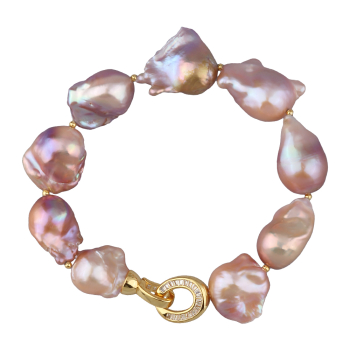 Изготовлено из ювелирного сплава на основе латуни с гальваническим покрытием золотом. Колье выполнено из натурального лососевого барочного жемчуга диаметром 15-25мм и фианитов белого цвета. Длина 21см. *Цвет и форма жемчужин может отличаться от изображени