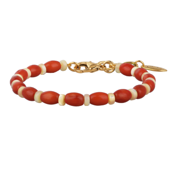 Изготовлено из ювелирного сплава на основе латуни с гальваническим покрытием золотом. Изделие украшает натуральны красный коралл и перламутр. Длина 17см. Замок-карабин с удлинителем 4см.