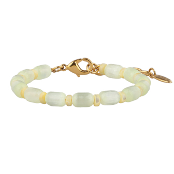 Изготовлено из ювелирного сплава на основе латуни с гальваническим покрытием золотом. Изделие украшает улексит цвета сливочное масло и перламутр. Длина 17см. Замок-карабин с удлинителем 4см.