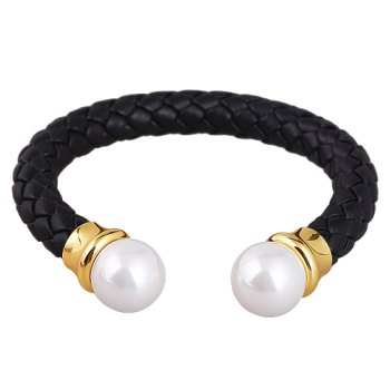 Браслет Дуэт (Майорка 14мм белая, кожа черная; покрытие золото), Есть комплект