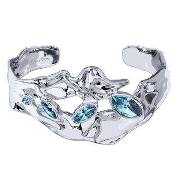 Изготовлено из ювелирного сплава на основе латуни с гальваническим покрытием родием. Изделие украшают кристаллы SW цвета аквамарин. Ширина 3.5см.
